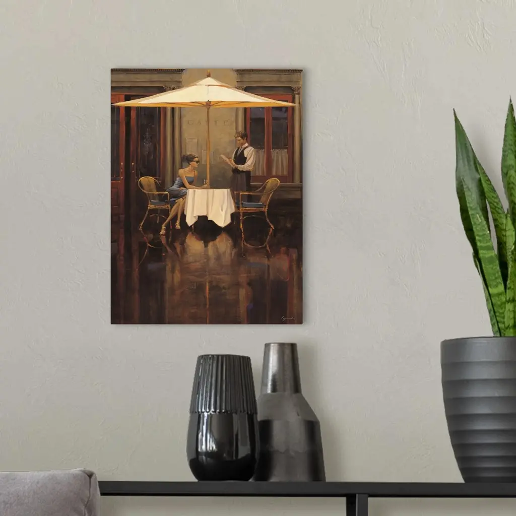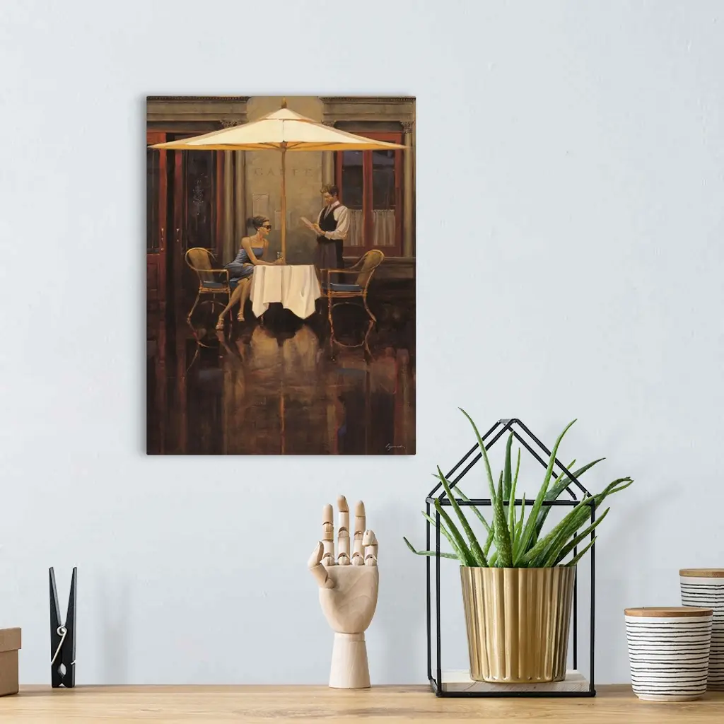 Contemporary painting of a woman sitting at a table outside a bistro looking to her left.