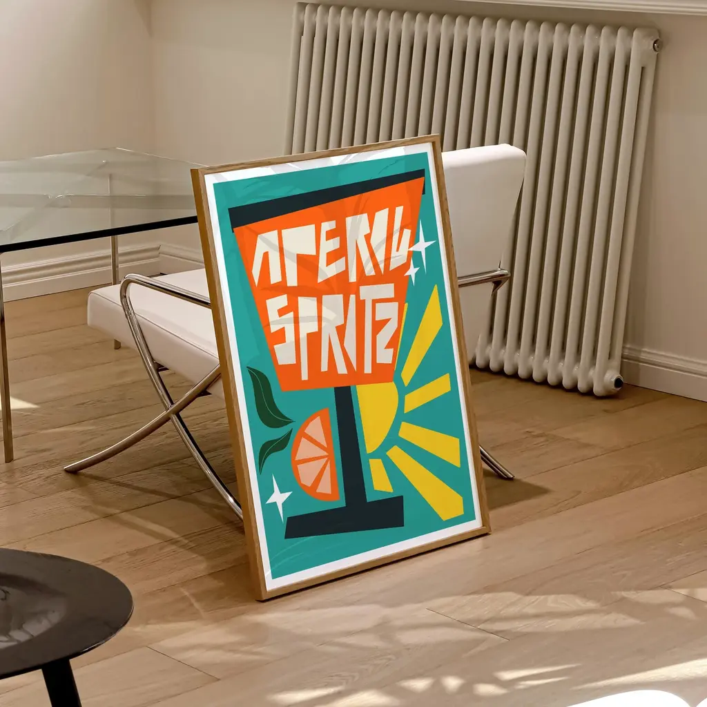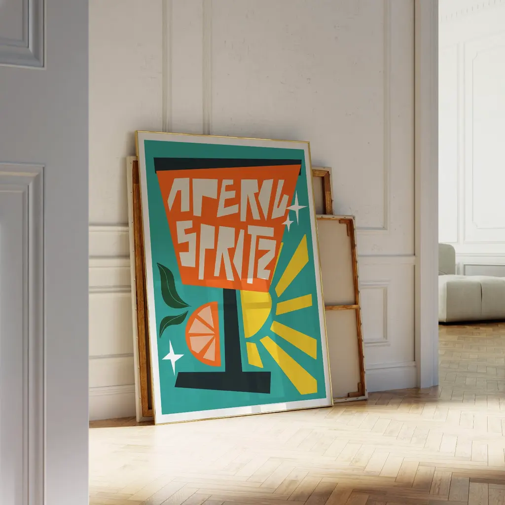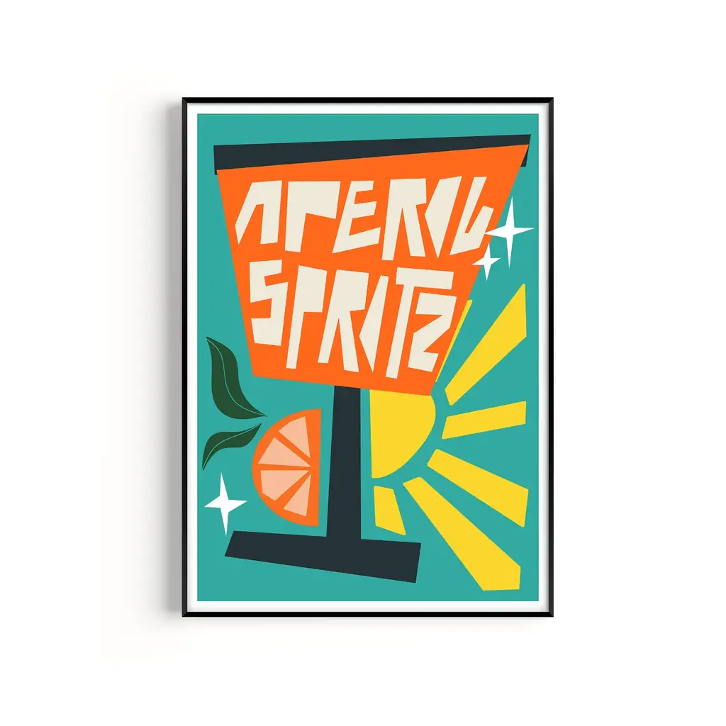 Aperol Spritz Print - A3 sizePerfect for cocktail enthusiasts, this captivating artwork captures the essence of the beloved aperol spritz cocktail. Elevate your home bar or kitchen décor with this stylish piece. All prints are digitally designed by myself and printed to order.Smooth fine art 230 gsm matte card. Printed with vivid colour and detail. Sold without a frame.