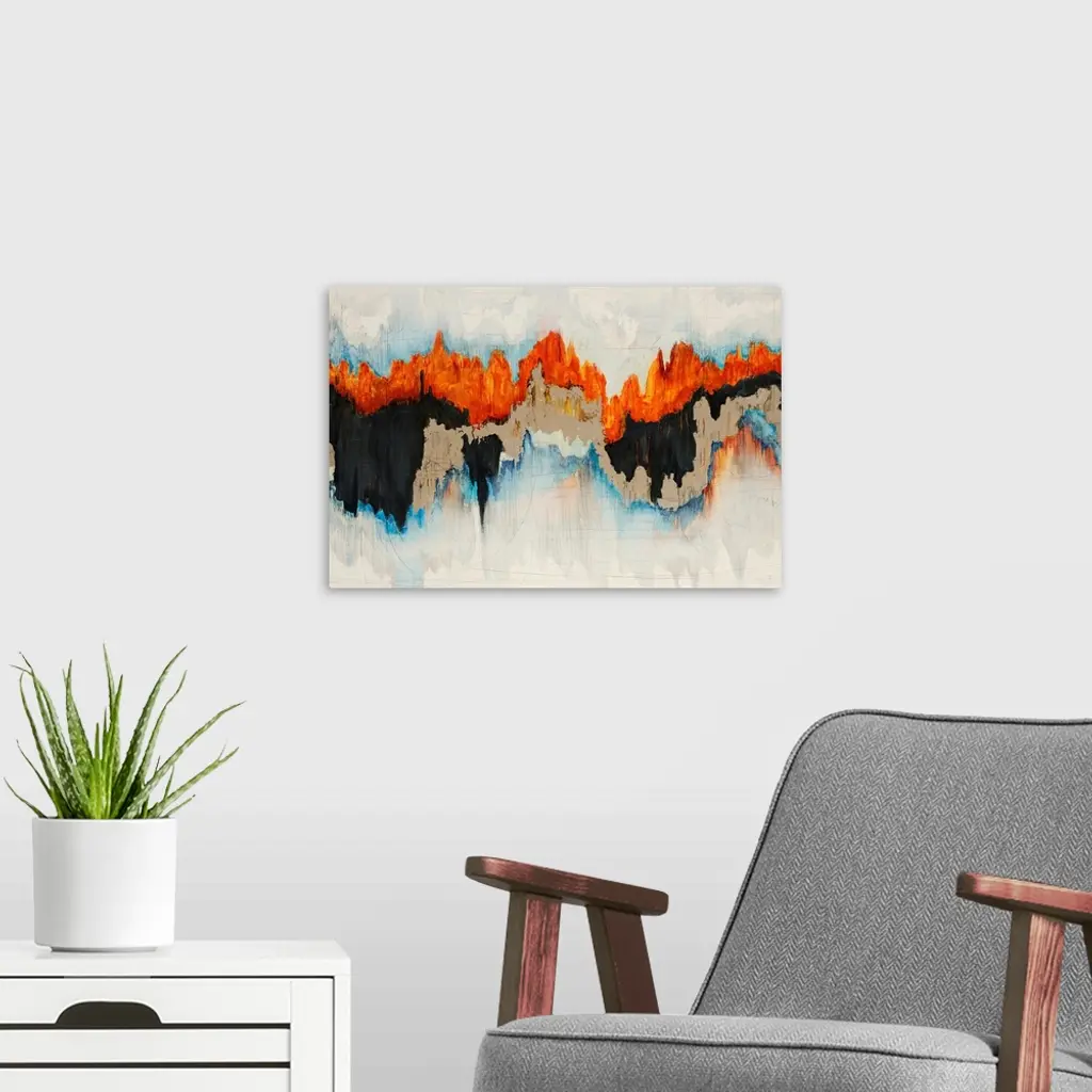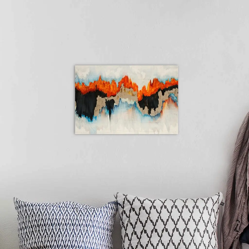 Contemporary abstract painting with jagged bright orange, tan, black and light blue lines over a cream background.