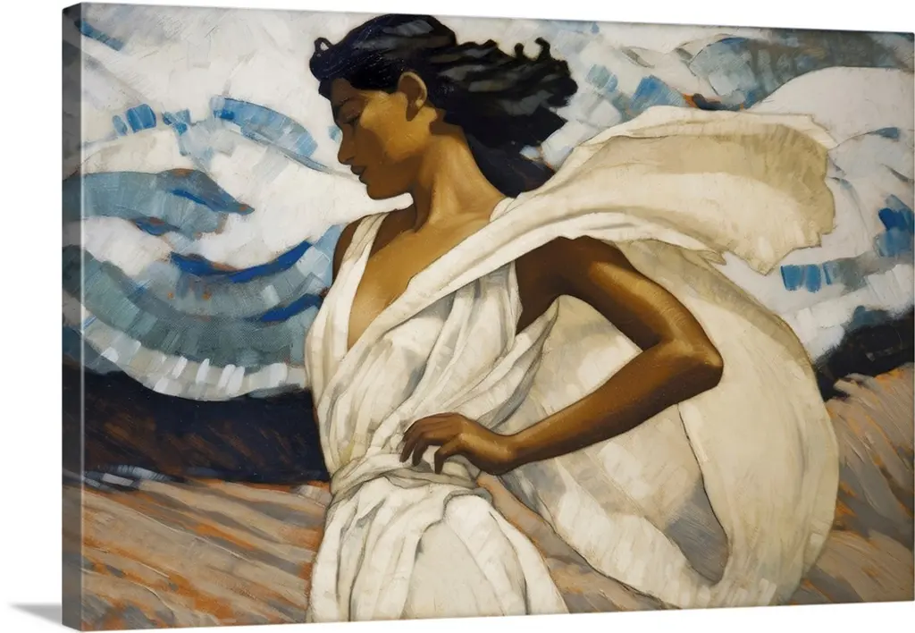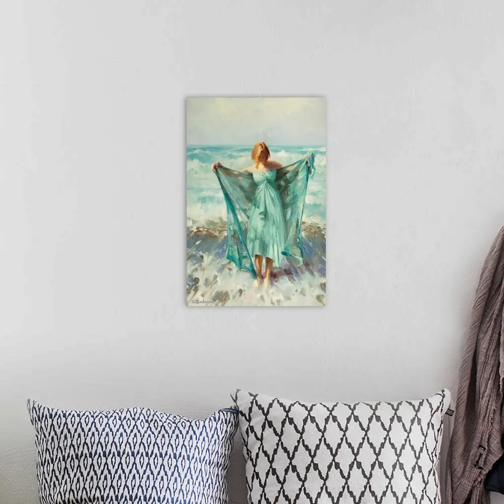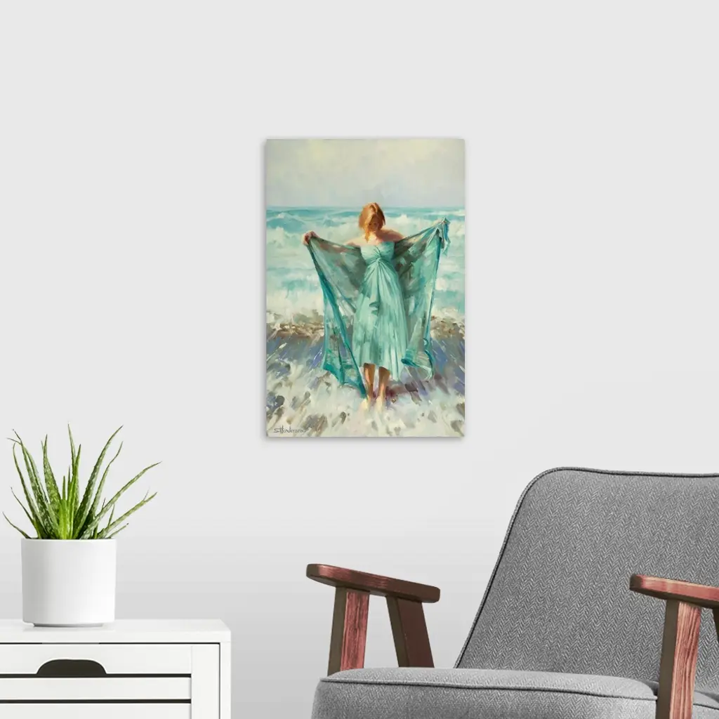 Traditional impressionist painting of a beautiful redheaded woman rising from a foam of sea surf and waves.