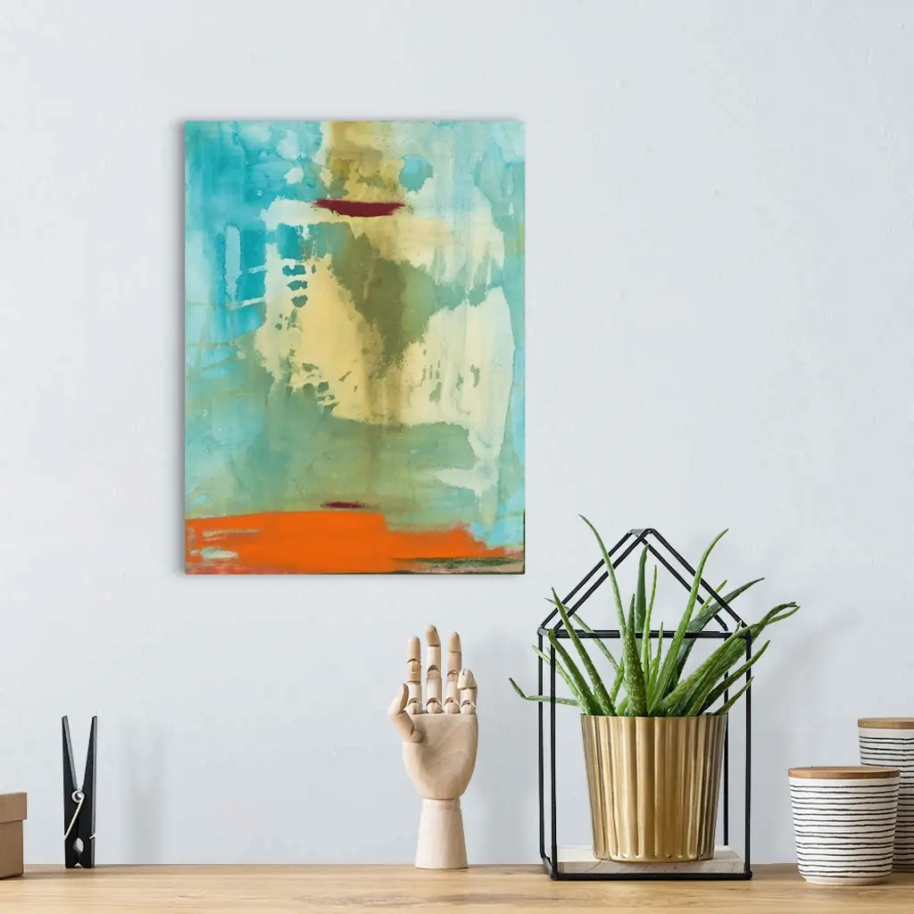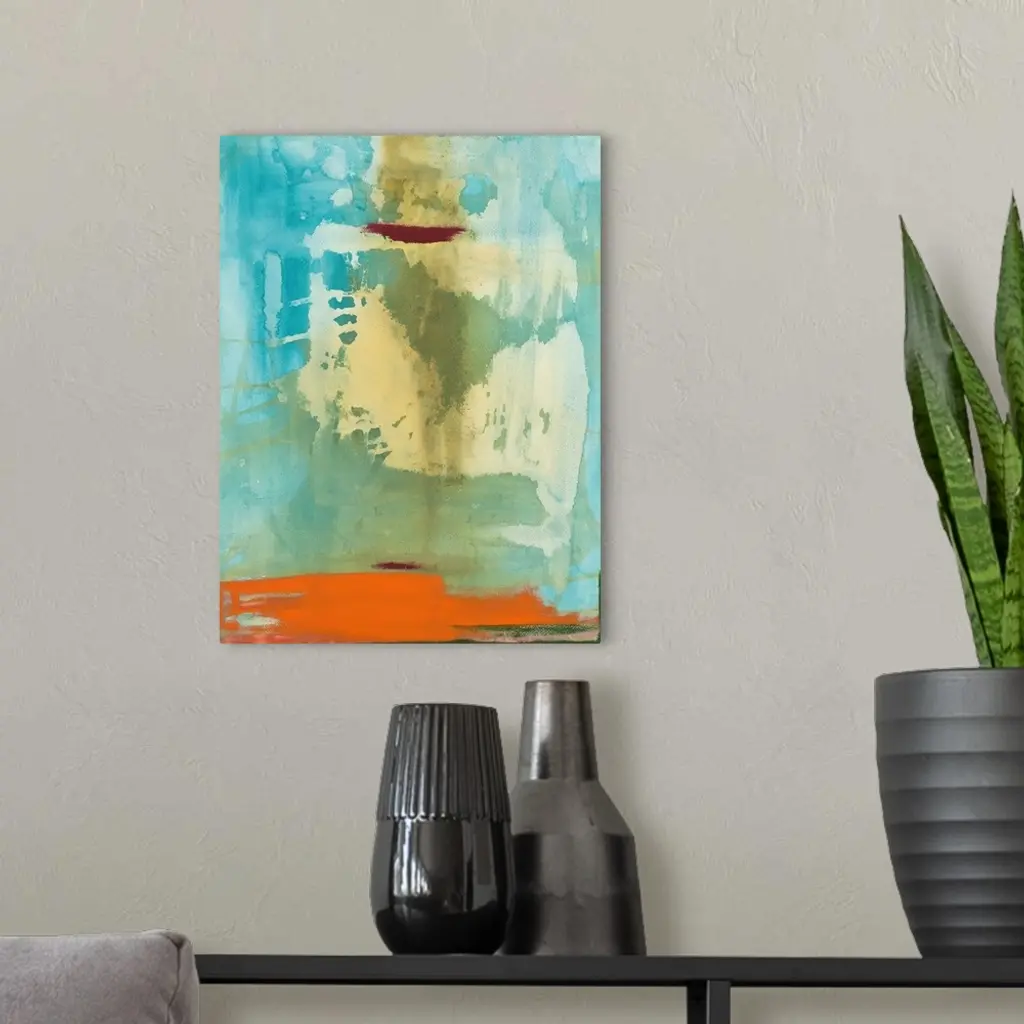 Large abstract painting with a blue background and a yellow overlay with orange and green at the bottom and a small deep red mark towards the top.