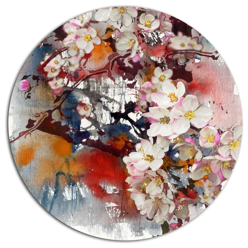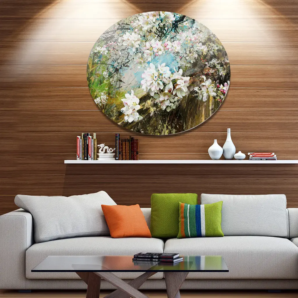 Bring Contemporary Abstraction to your home with this large Circle Metal wall art. This Apple Blossoms With White Flowers Metal Artwork makes it the focal point of any room or office. - White Gloss Coating ensures colors are extra vibrant with light reflection.- Aluminum grade Sheet Metal with 1 inch mounting frame on the back giving the illusion that the artwork is floating on the wall..- Mounting Brackets are included along with instructions.- High Quality Digital images are created directly into a glossy aluminum panel producing a stunning and captivating print into the glossy finish of the metal.- Water, Fire and Scratch resistant HD Aluminum panels.- Looks better than any photo paper and guaranteed to last at least 20 years- Easy to clean with a microfiber cloth. Colors are far superior to regular Canvas Art. - Easy to Hang