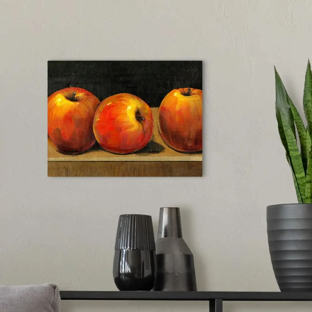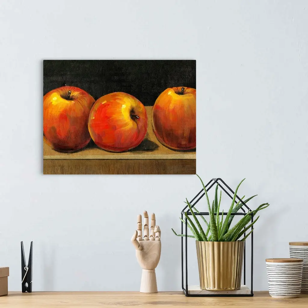 Big still life painting of three apples sitting on a desk on canvas.