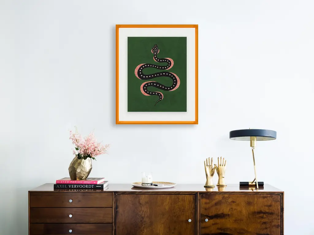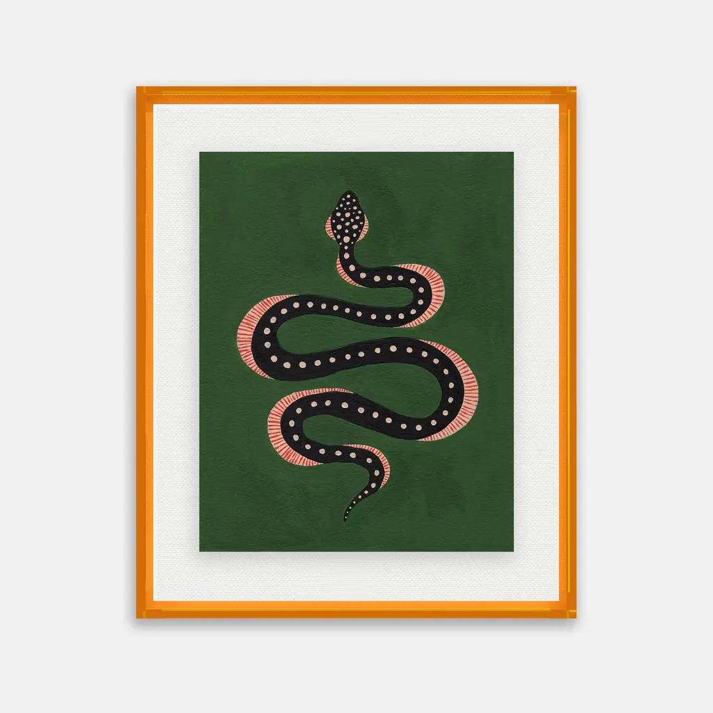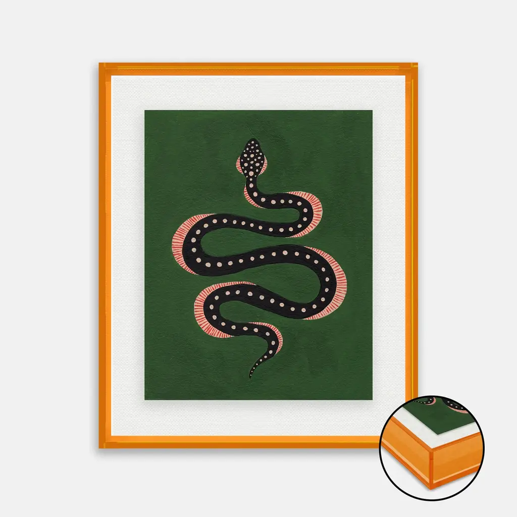 DESCRIPTION: Apple the Snake by Willa Heart in Amber Orange Acrylic Shadowbox, Medium Art Print SPECIFICATIONS: Type: Acrylic Shadowbox. Framed Size (in): 40x36. Orientation: Vertical. Flush/Float/Matted: Floated. Frame Color: Amber Orange Acrylic Shadowbox. Hanging Hardware: Z Bar. FRAMING: Each art work arrives framed and ready to hang. We use handmade frames with a plexiglass glazing front, because it offers less glare than standard glass. At this time, we only offer framed prints. ARTIST BIO: Willa Heart is the brainchild of artist and designer Alyssa Jill Harris. Alyssa was born and raised in Boston, MA, and currently lives in Camden, SC. After being diagnosed at a young age as dyslexic, Alyssa’s mother (whose middle name is Willa) immersed her in the arts knowing her strengths would lie outside of the classroom. Alyssa credits her dyslexia for allowing her to see the world differently, which has made her extra creative. Alyssa has attended University of Hartford Art School, School of the Museum of Fine Arts Boston, North Bennet Street School, & Boca Raton Museum Art School.