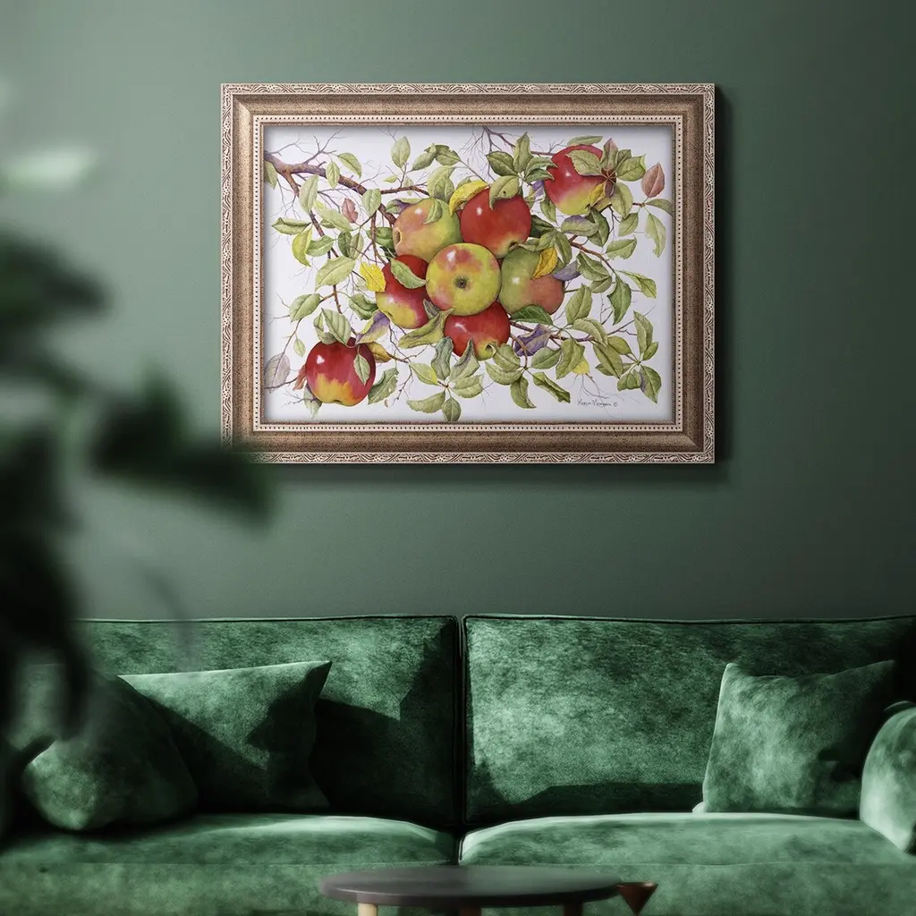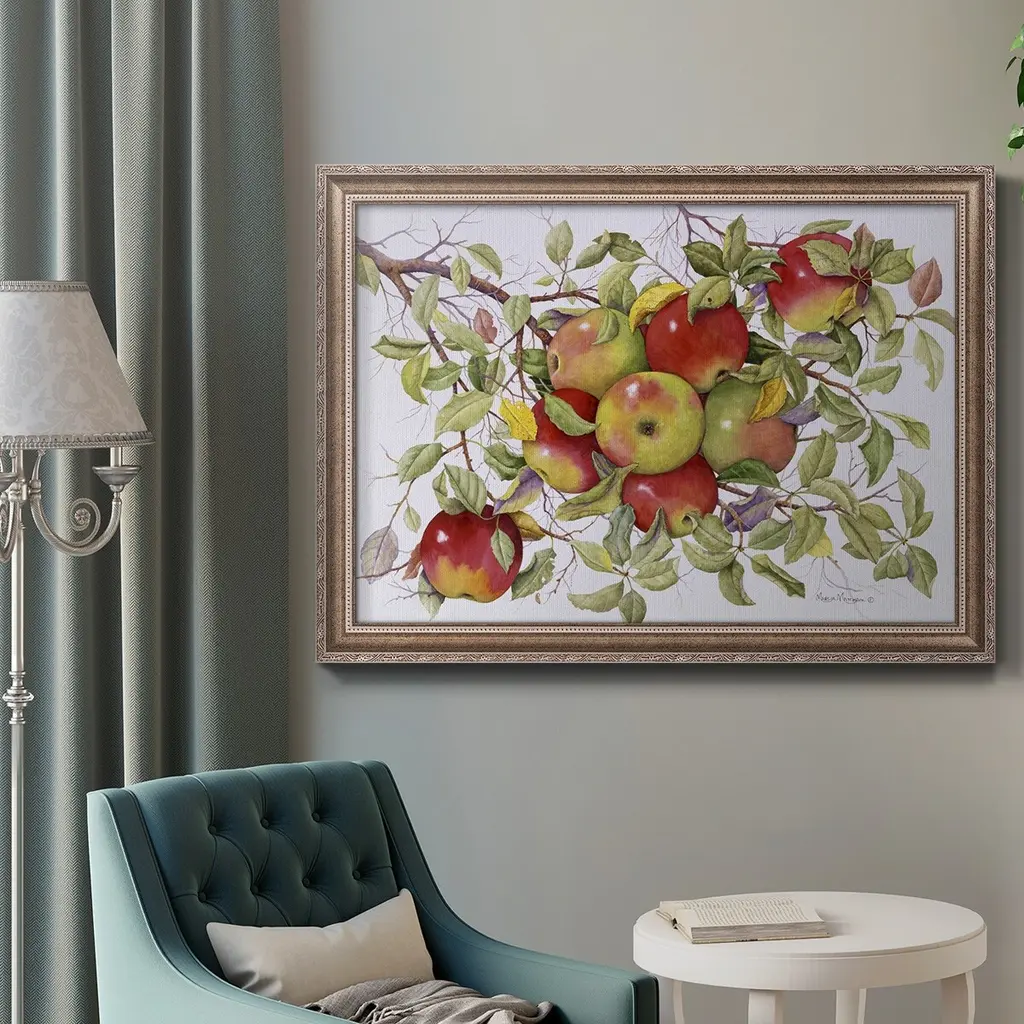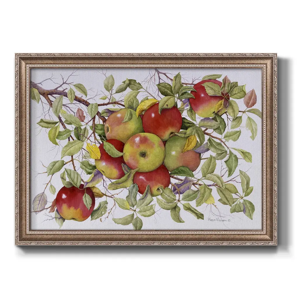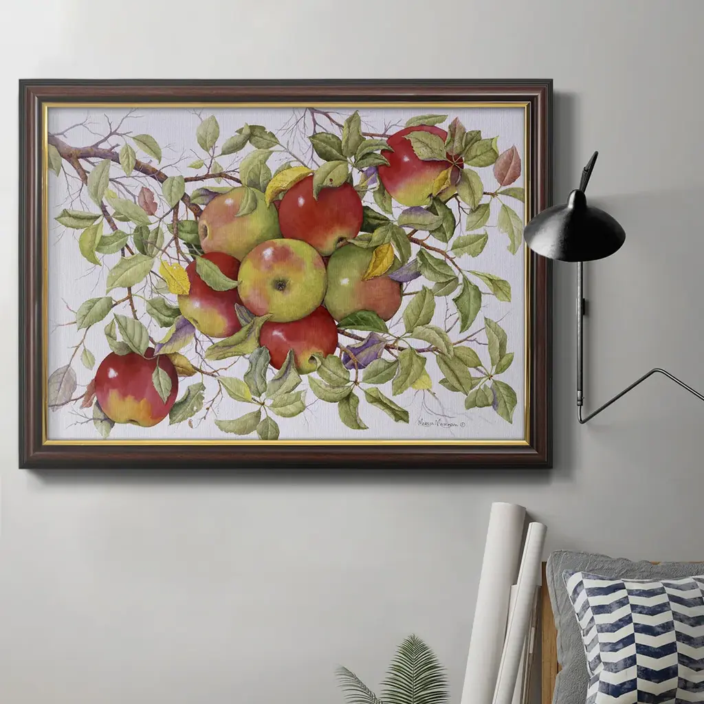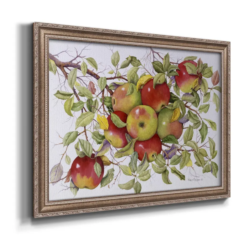 Apples Premium Framed Canvas- Ready to Hang A Premium Framed Canvas created to last. Framed in distressed wood and available in an array of sizes and colors Featuring a beveled a solid wood stretcher bar, each piece comes ready to hand 3 SIZES AVAILABLE 16''X20'' - Overall Size 18'X27'' - Overall Size 24''x36'' - Overall Size Each piece is made to order. Each piece comes with hanging hardware. Made in the USA Ready to Hang Giclee Paper Print Acrylic Glass Beveled Matt Board