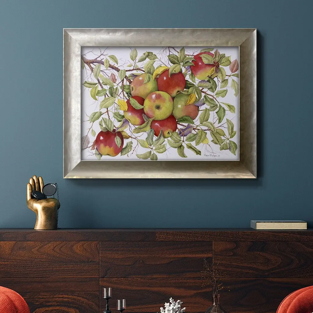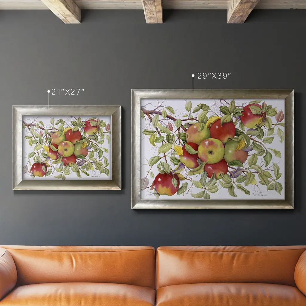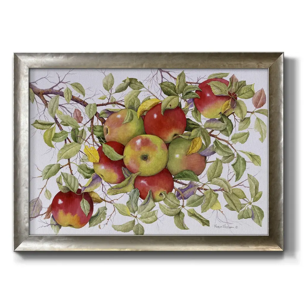 Apples Premium Framed Canvas- Ready to Hang A Premium Framed Canvas created to last. Framed in distressed wood and available in an array of sizes and colors Featuring a beveled a solid wood stretcher bar, each piece comes ready to hand 3 SIZES AVAILABLE 16''X20'' - Overall Size 18'X27'' - Overall Size 24''x36'' - Overall Size Each piece is made to order. Each piece comes with hanging hardware. Made in the USA Ready to Hang Giclee Paper Print Acrylic Glass Beveled Matt Board