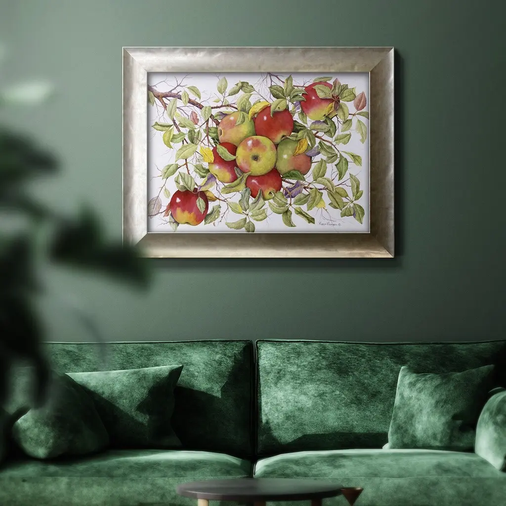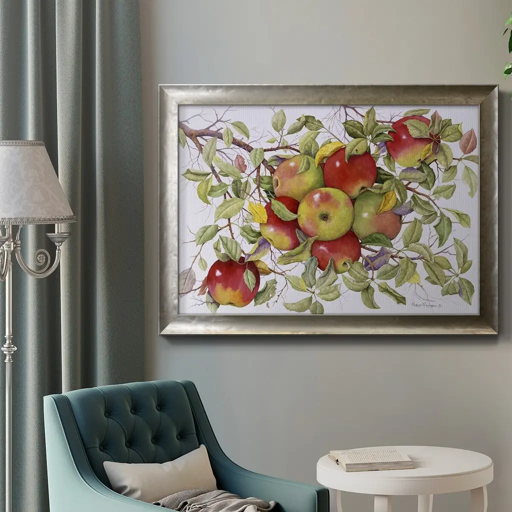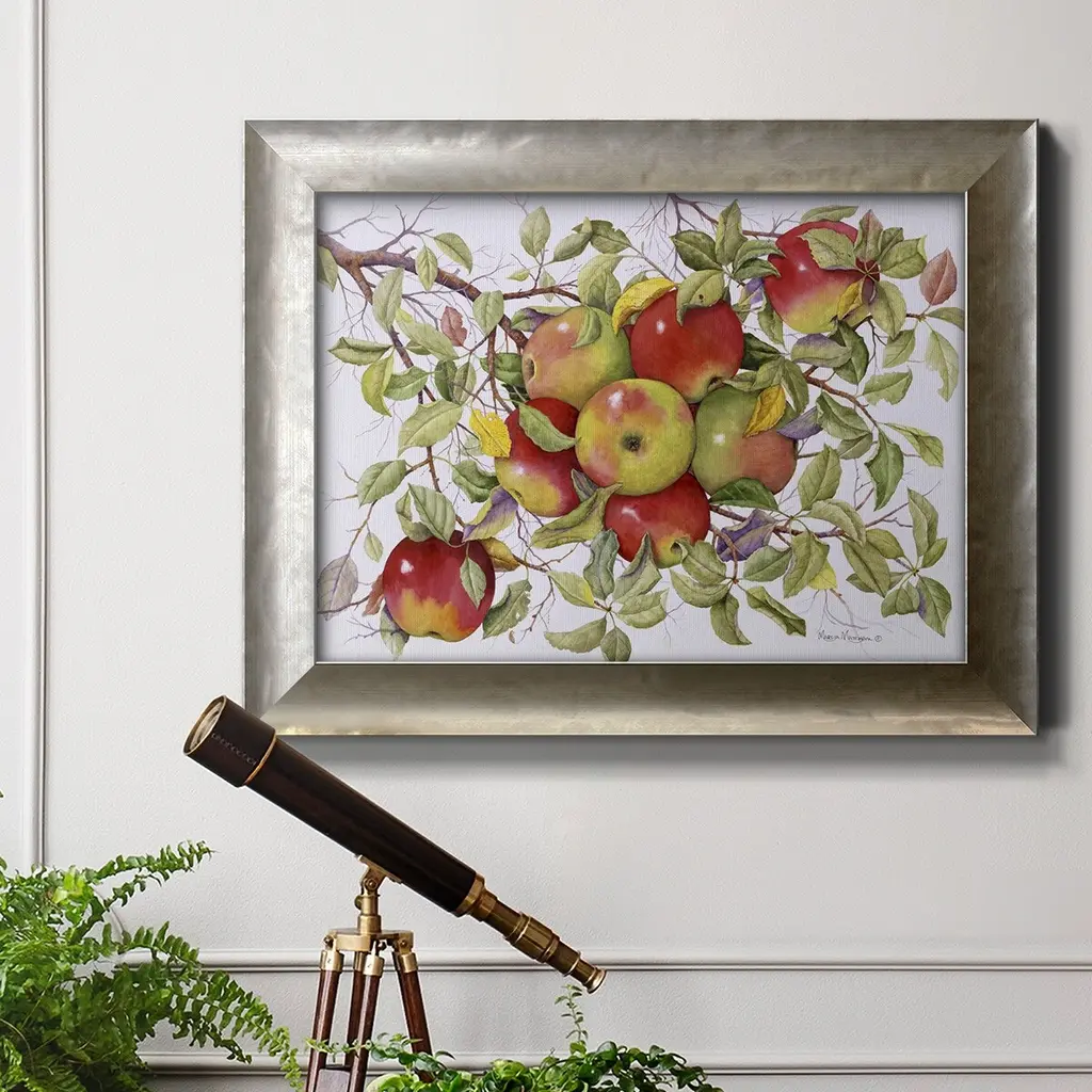 Apples Premium Framed Canvas- Ready to Hang A Premium Framed Canvas created to last. Framed in distressed wood and available in an array of sizes and colors Featuring a beveled a solid wood stretcher bar, each piece comes ready to hand 3 SIZES AVAILABLE 16''X20'' - Overall Size 18'X27'' - Overall Size 24''x36'' - Overall Size Each piece is made to order. Each piece comes with hanging hardware. Made in the USA Ready to Hang Giclee Paper Print Acrylic Glass Beveled Matt Board