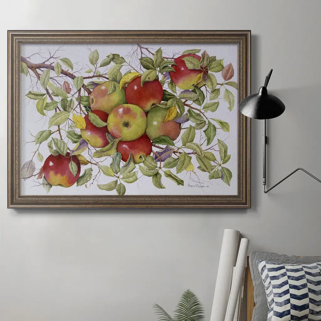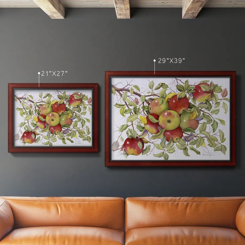 Apples Premium Framed Canvas- Ready to Hang A Premium Framed Canvas created to last. Framed in distressed wood and available in an array of sizes and colors Featuring a beveled a solid wood stretcher bar, each piece comes ready to hand 3 SIZES AVAILABLE 16''X20'' - Overall Size 18'X27'' - Overall Size 24''x36'' - Overall Size Each piece is made to order. Each piece comes with hanging hardware. Made in the USA Ready to Hang Giclee Paper Print Acrylic Glass Beveled Matt Board