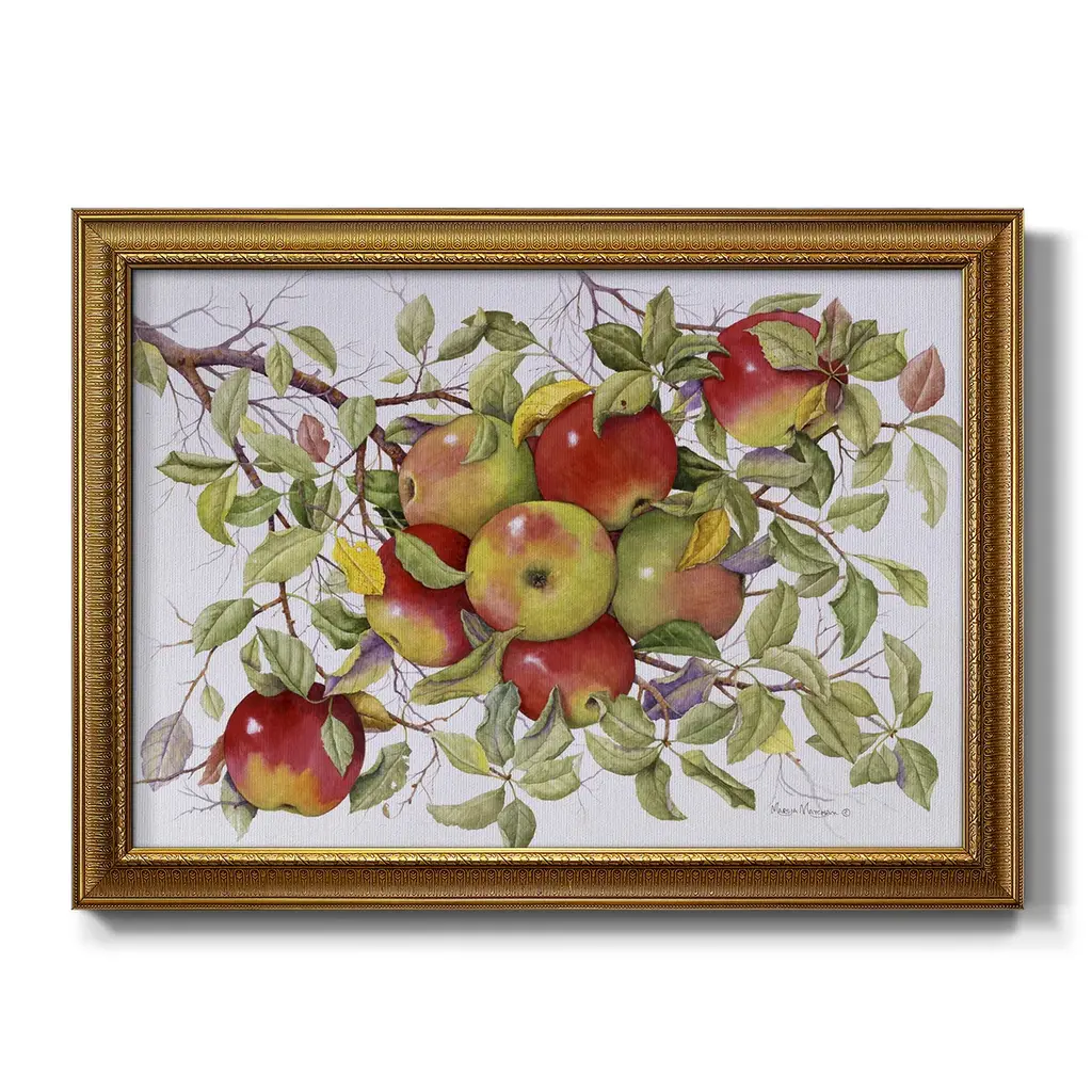 Apples Premium Framed Canvas- Ready to Hang A Premium Framed Canvas created to last. Framed in distressed wood and available in an array of sizes and colors Featuring a beveled a solid wood stretcher bar, each piece comes ready to hand 3 SIZES AVAILABLE 16''X20'' - Overall Size 18'X27'' - Overall Size 24''x36'' - Overall Size Each piece is made to order. Each piece comes with hanging hardware. Made in the USA Ready to Hang Giclee Paper Print Acrylic Glass Beveled Matt Board