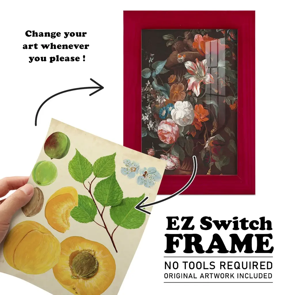 Apricot Study II -EZ SWITCH Framed Print w/glass-Cherry Red A delightful, framed print. Featuring a solid wood frame with real wood glass. This premium print is giclee quality. In addition, every frame features a removable back and table top stand. This allows you to change your art in the future or to just stand the art on a table for a new look. We are sure you'll enjoy our new series of EZ SWITCH Framed Art. Solid Wood Frame Real Glass Removable / Replaceable Art Built in Tabletop Stand Sizes range from 4x6 up to 12x15 - buy just one or pair them up as sets as you see fit.
