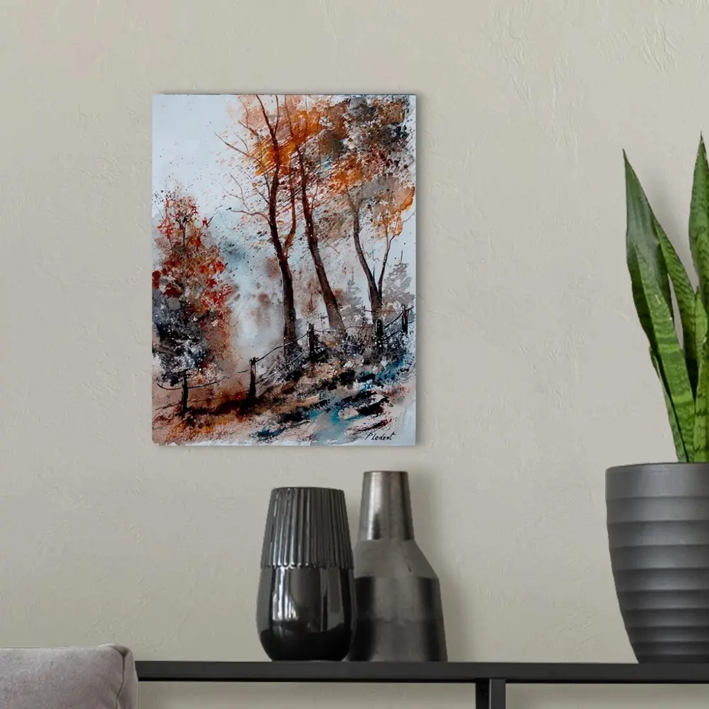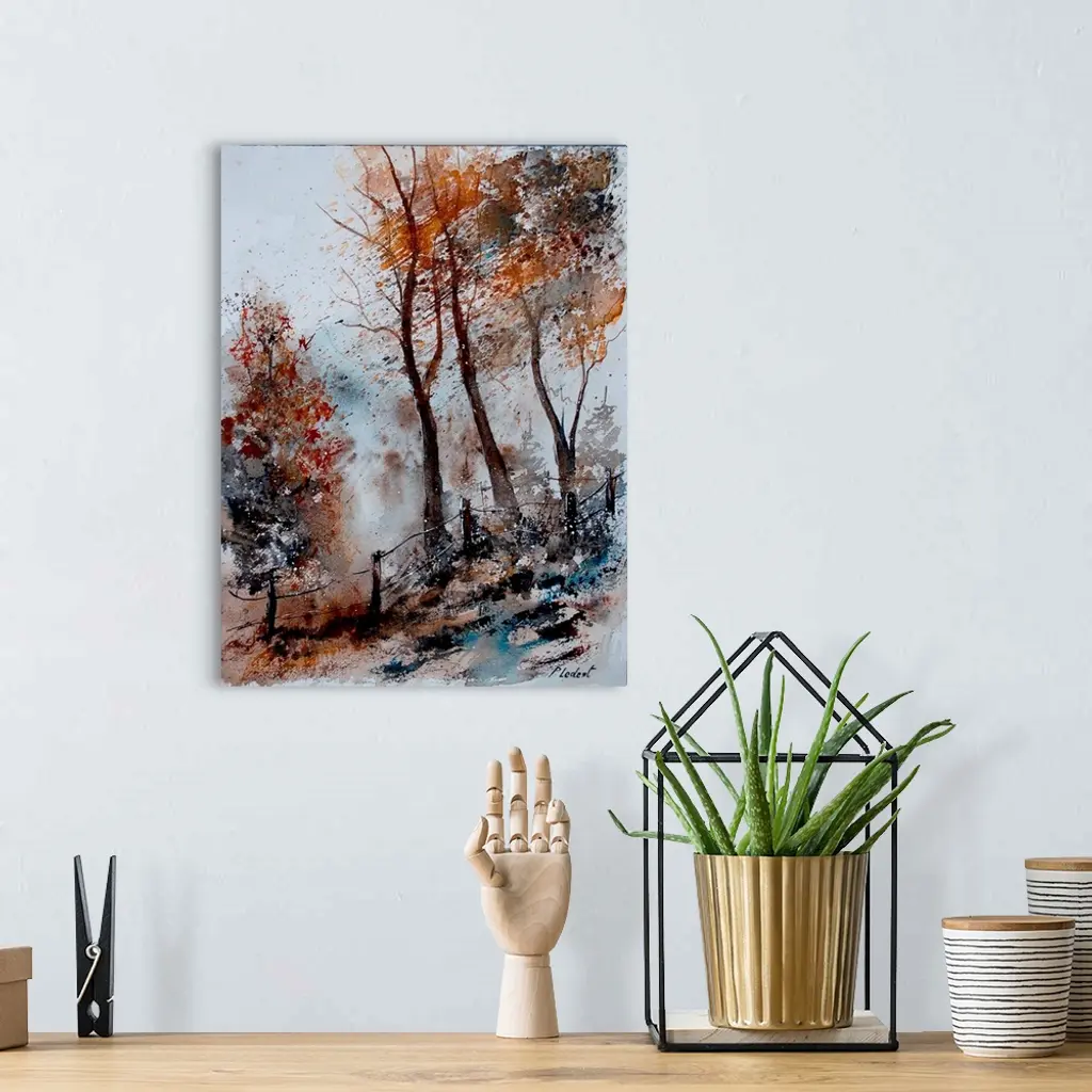 Watercolor painting of trees in a forest done in muted colors of brown, gray and blue.