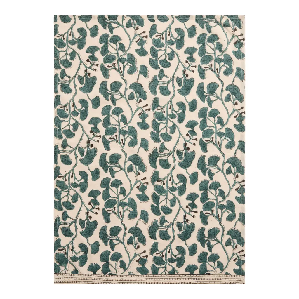 World Market is the destination for handcrafted block-printed kitchen and table linens like this unique gingko-leaf tea towel with a dot border. A carved wood stamp is inked with gray and aqua colors and pressed onto a cotton and linen-blend fabric with careful precision by multiple skilled artists. As its layers are stamped one by one, the natural fibers absorb the ink to create slight variations on each piece that add character to your kitchen.