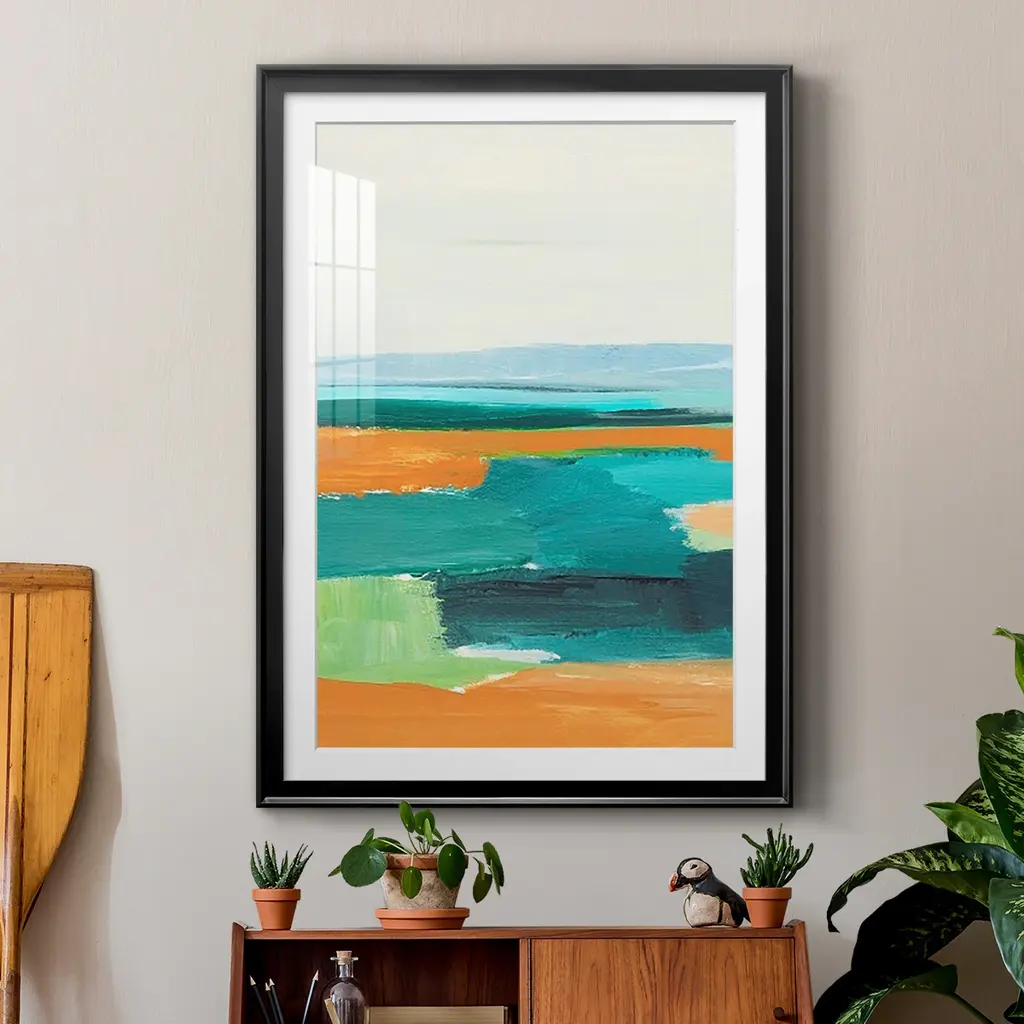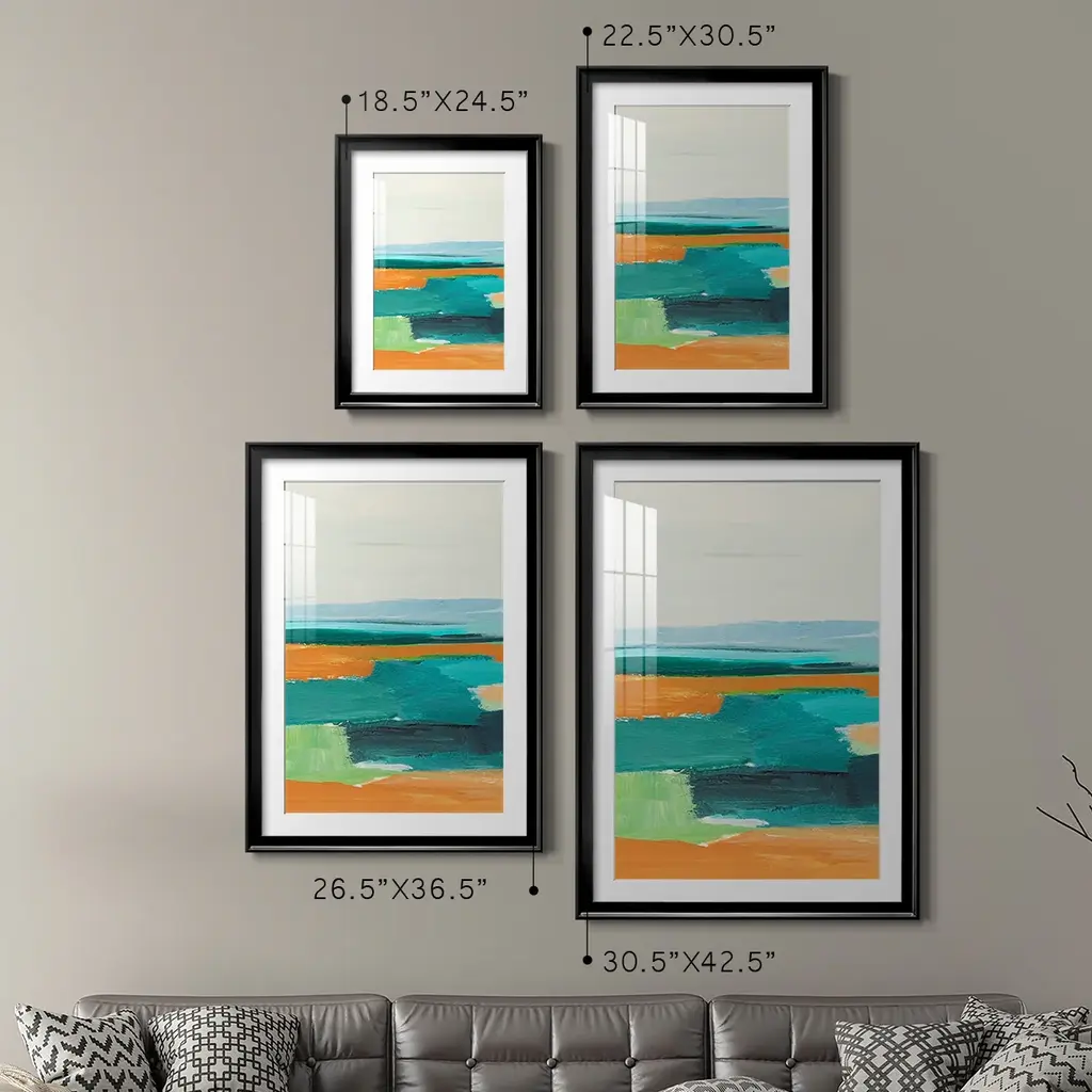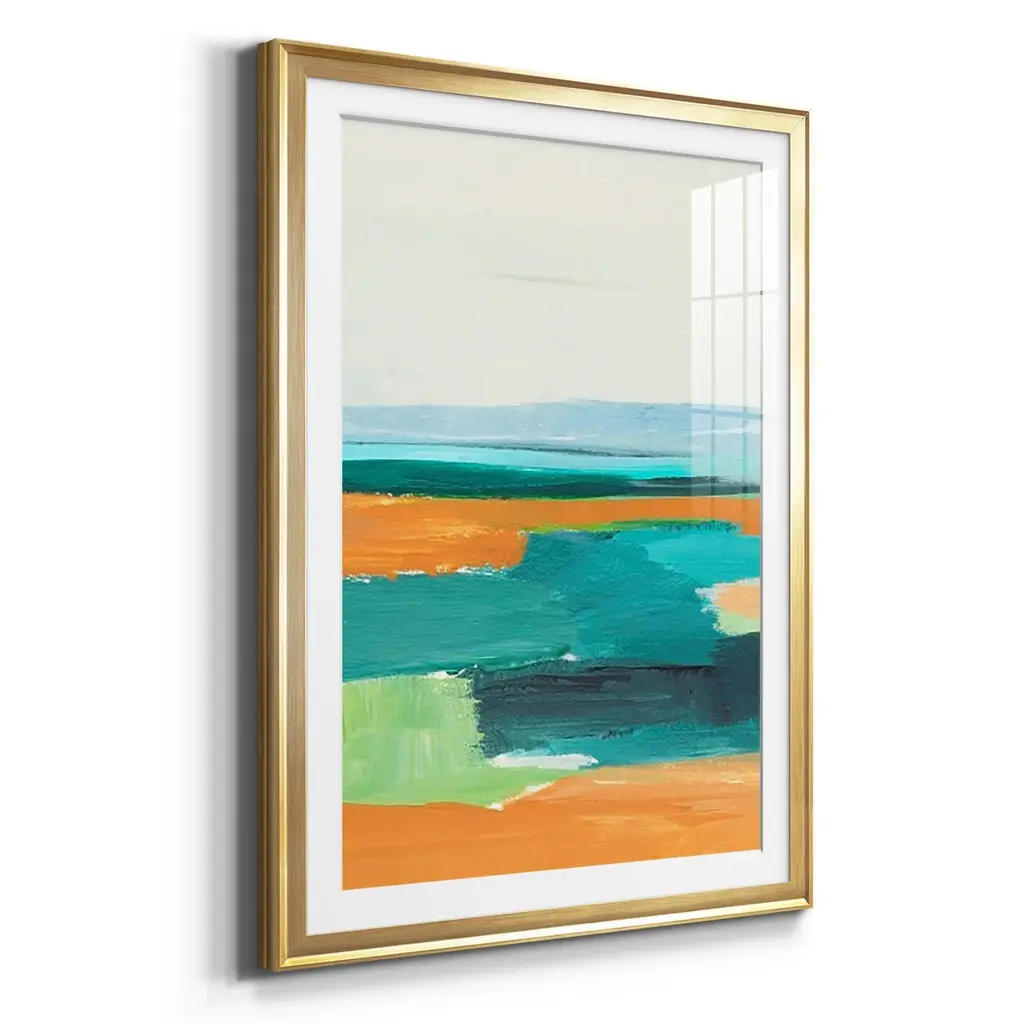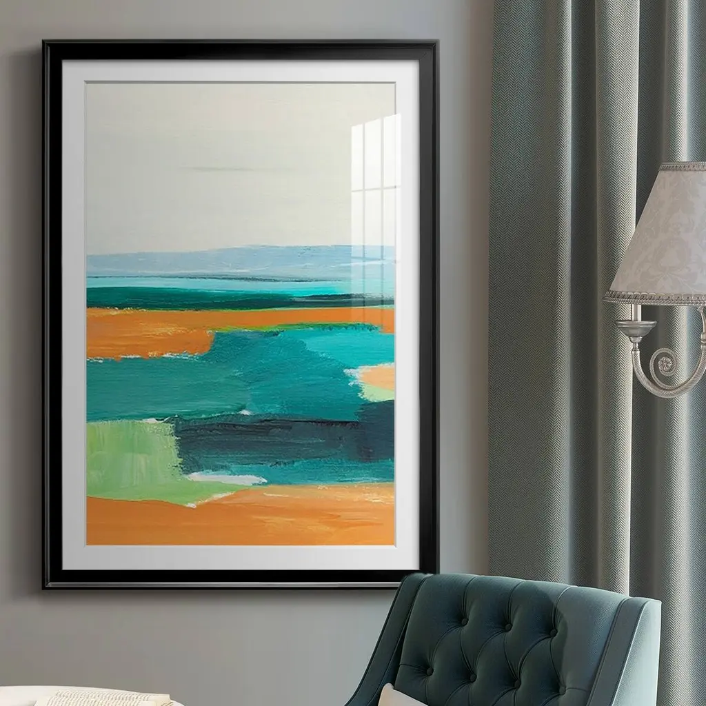 Aqua and Orange I Premium Framed Print - Ready to Hang A Premium Framed Print created to last. Framed in distressed wood and available in an array of sizes and colors Featuring a beveled a solid wood stretcher bar, each piece comes ready to hand 4 SIZES AVAILABLE 30.5''X42.5'' - Overall Size 26.5'X36.5'' - Overall Size 22.5''x30.5'' - Overall Size 18.5''x24.5'' - Overall Size Each piece is made to order. Each piece comes with hanging hardware. Made in the USA Ready to Hang Giclee Paper Print Acrylic Glass Beveled Matt Board