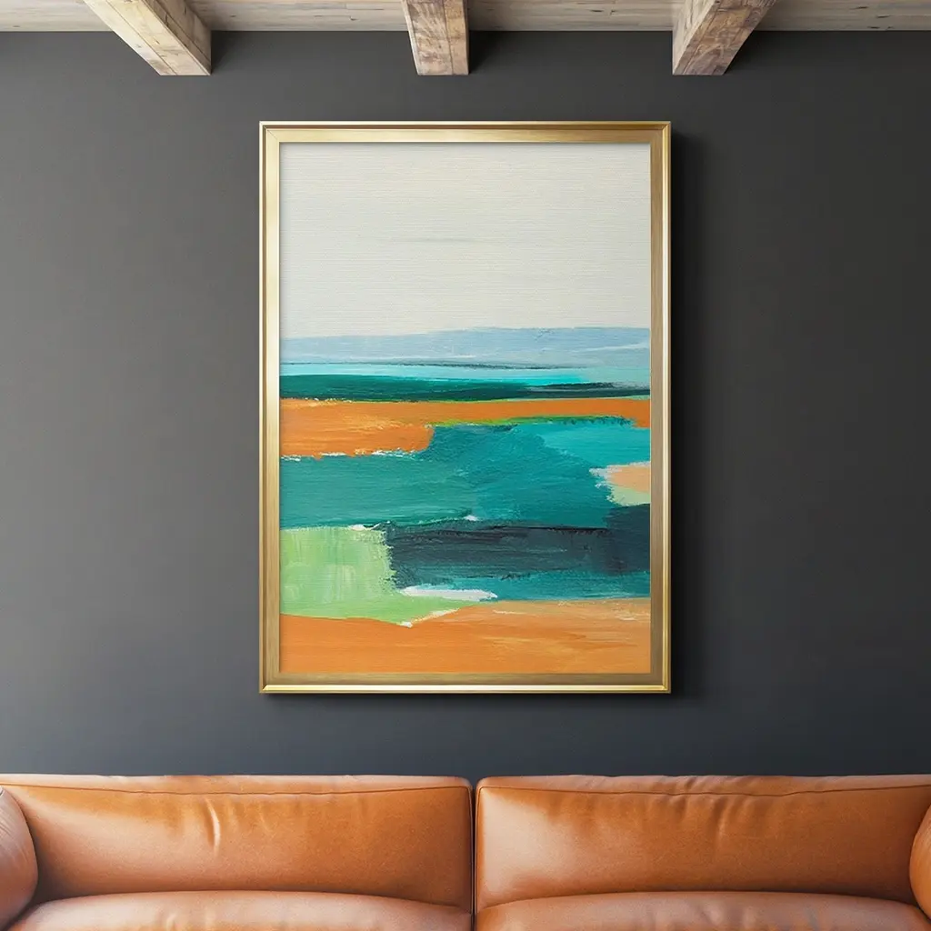 Aqua and Orange I Premium Framed Print - Ready to Hang A Premium Framed Print created to last. Framed in distressed wood and available in an array of sizes and colors Featuring a beveled a solid wood stretcher bar, each piece comes ready to hand 4 SIZES AVAILABLE 30.5''X42.5'' - Overall Size 26.5'X36.5'' - Overall Size 22.5''x30.5'' - Overall Size 18.5''x24.5'' - Overall Size Each piece is made to order. Each piece comes with hanging hardware. Made in the USA Ready to Hang