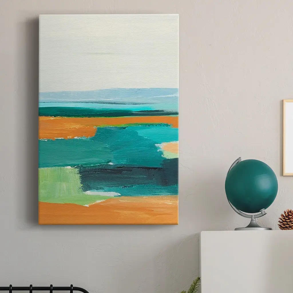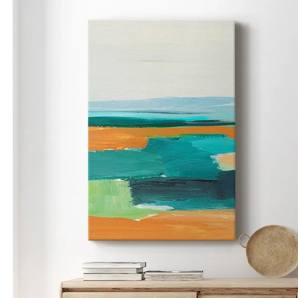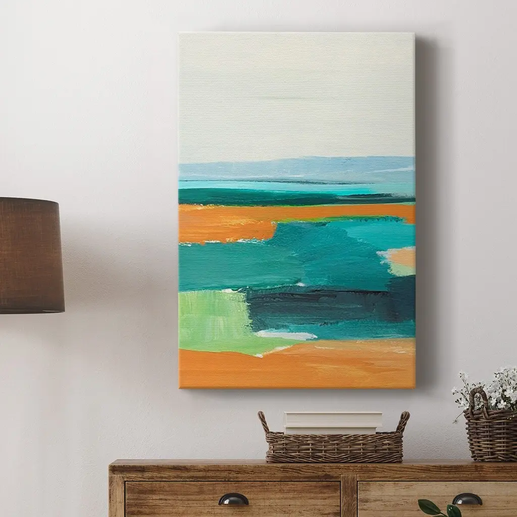 Aqua and Orange I Premium Gallery Wrapped Canvas - Ready to Hang A premium hand stretched gallery wrapped canvas print created to last. Featuring a beveled a solid wood stretcher bar, each piece comes ready to hand 6 SIZES AVAILABLE 8''X12'' - Overall Size 12''X18'' - Overall Size 18''X27'' - Overall Size 24''x36'' - Overall Size 32''x48'' - Overall Size 40''x60'' - Overall Size Each piece is made to order. Built to Last Each piece comes ready to hang Solid wood stretcher Fade and Water resistant Made domestically
