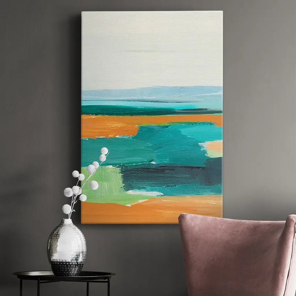 Aqua and Orange I Premium Gallery Wrapped Canvas - Ready to Hang A premium hand stretched gallery wrapped canvas print created to last. Featuring a beveled a solid wood stretcher bar, each piece comes ready to hand 6 SIZES AVAILABLE 8''X12'' - Overall Size 12''X18'' - Overall Size 18''X27'' - Overall Size 24''x36'' - Overall Size 32''x48'' - Overall Size 40''x60'' - Overall Size Each piece is made to order. Built to Last Each piece comes ready to hang Solid wood stretcher Fade and Water resistant Made domestically