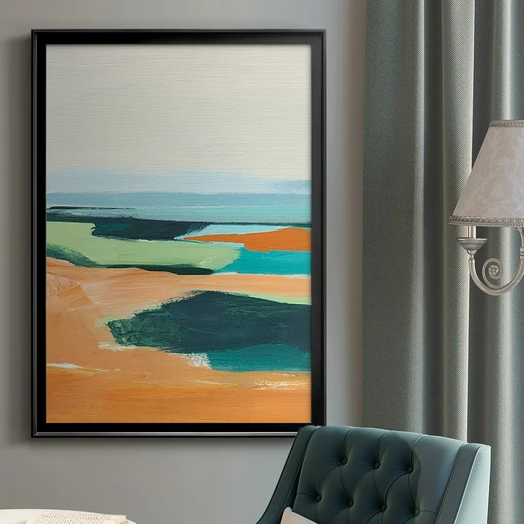 Aqua and Orange II Premium Framed Print - Ready to Hang A Premium Framed Print created to last. Framed in distressed wood and available in an array of sizes and colors Featuring a beveled a solid wood stretcher bar, each piece comes ready to hand 4 SIZES AVAILABLE 30.5''X42.5'' - Overall Size 26.5'X36.5'' - Overall Size 22.5''x30.5'' - Overall Size 18.5''x24.5'' - Overall Size Each piece is made to order. Each piece comes with hanging hardware. Made in the USA Ready to Hang