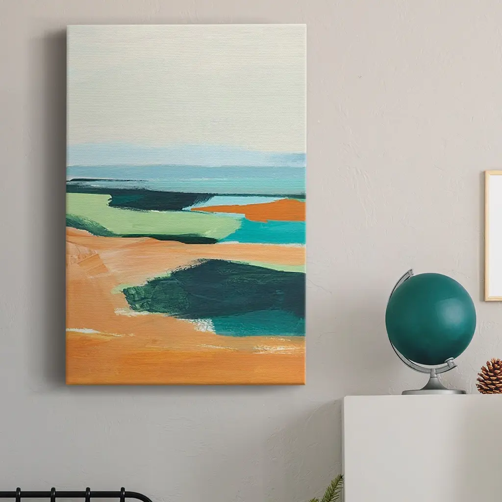 Aqua and Orange II Premium Gallery Wrapped Canvas - Ready to Hang A premium hand stretched gallery wrapped canvas print created to last. Featuring a beveled a solid wood stretcher bar, each piece comes ready to hand 6 SIZES AVAILABLE 8''X12'' - Overall Size 12''X18'' - Overall Size 18''X27'' - Overall Size 24''x36'' - Overall Size 32''x48'' - Overall Size 40''x60'' - Overall Size Each piece is made to order. Built to Last Each piece comes ready to hang Solid wood stretcher Fade and Water resistant Made domestically