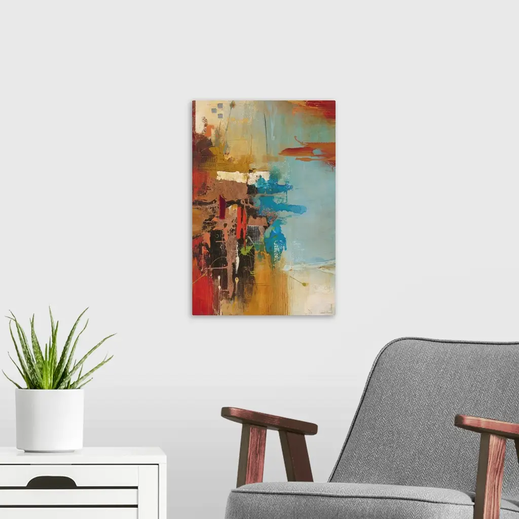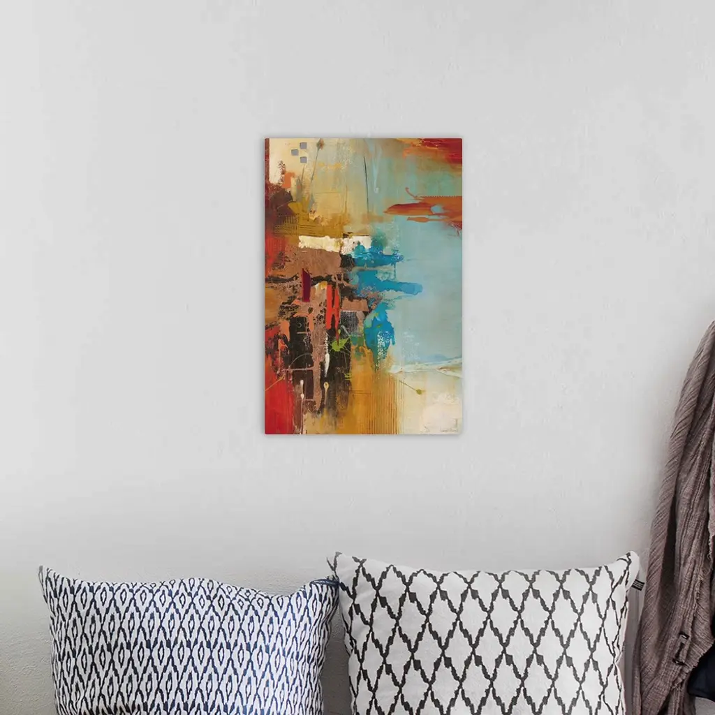 Contemporary abstract artwork using rich earthy tones and textures, mixed with aqua blue tones.