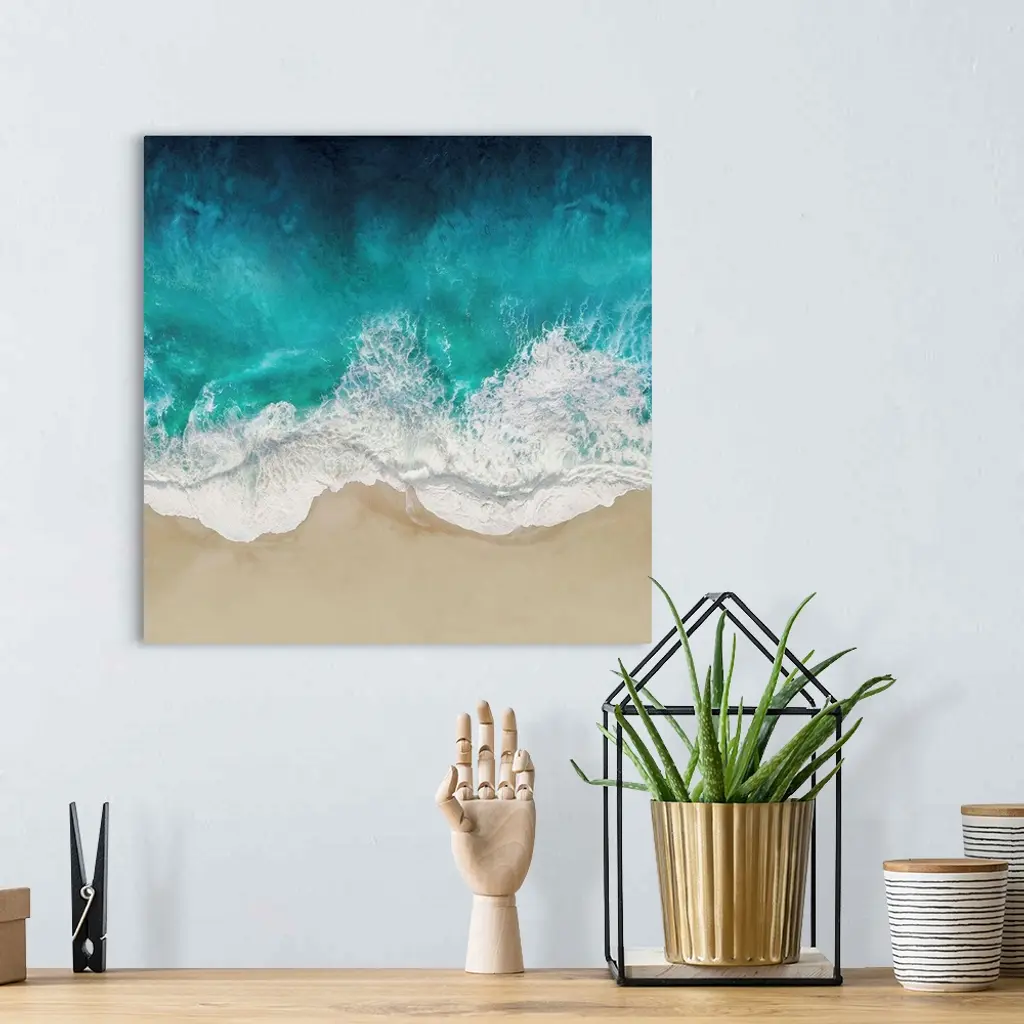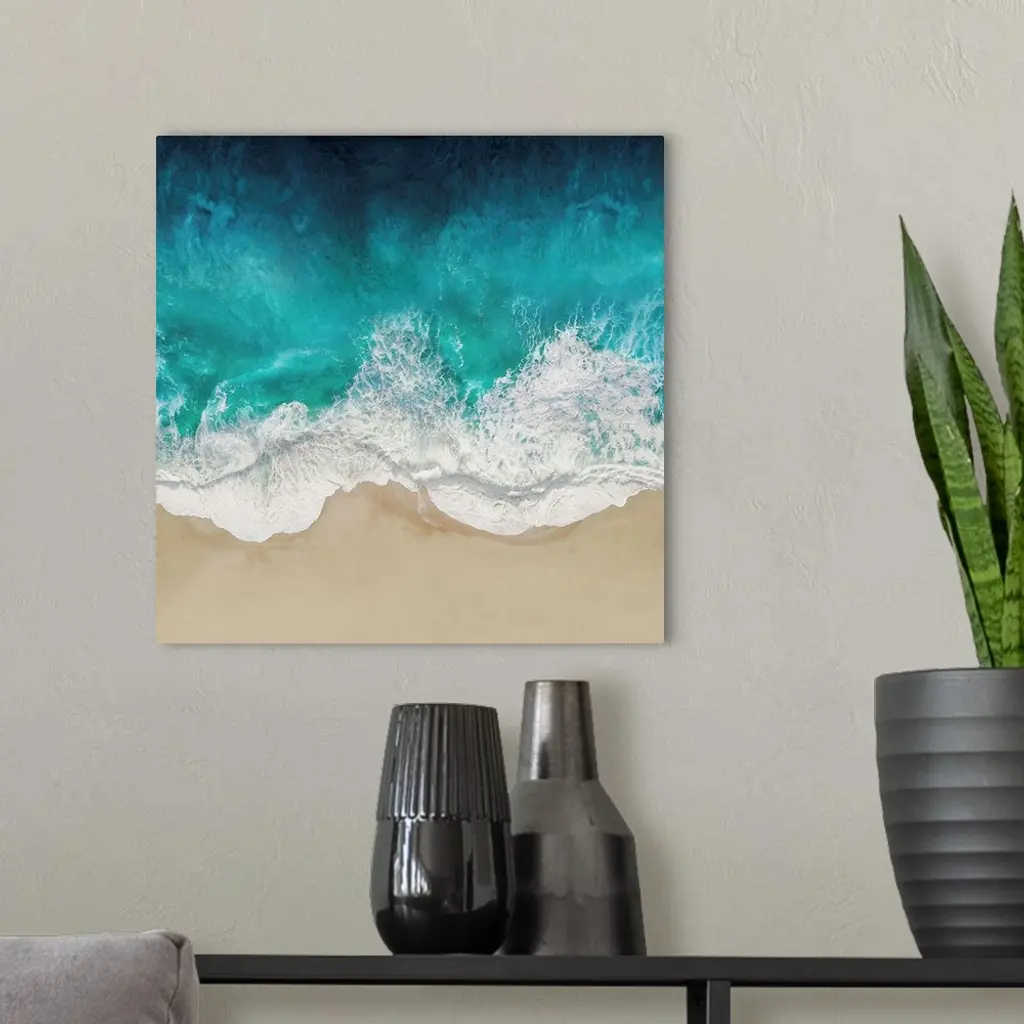 One artwork in a series of aerial shots of a beach as vibrant blue waves break upon the shore.