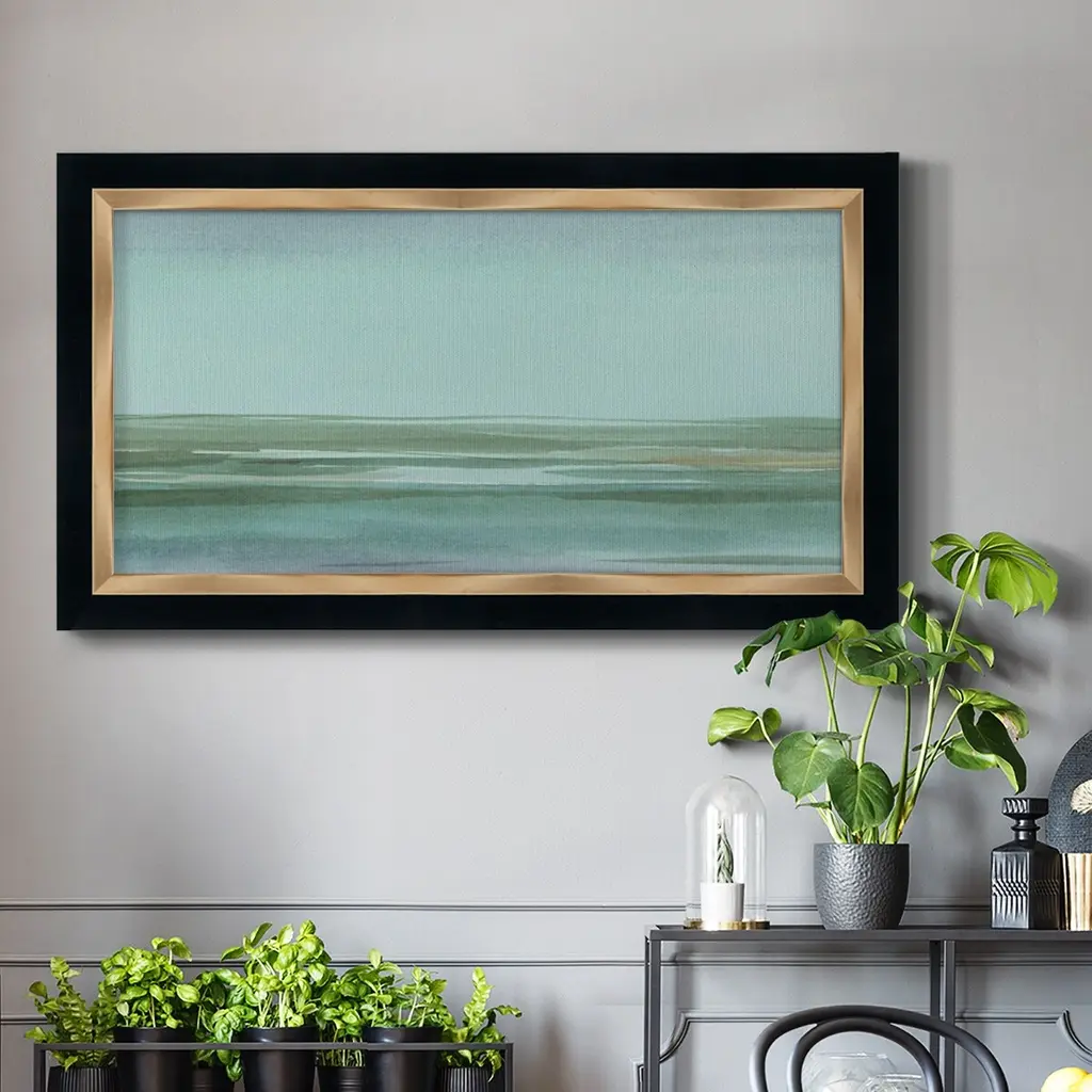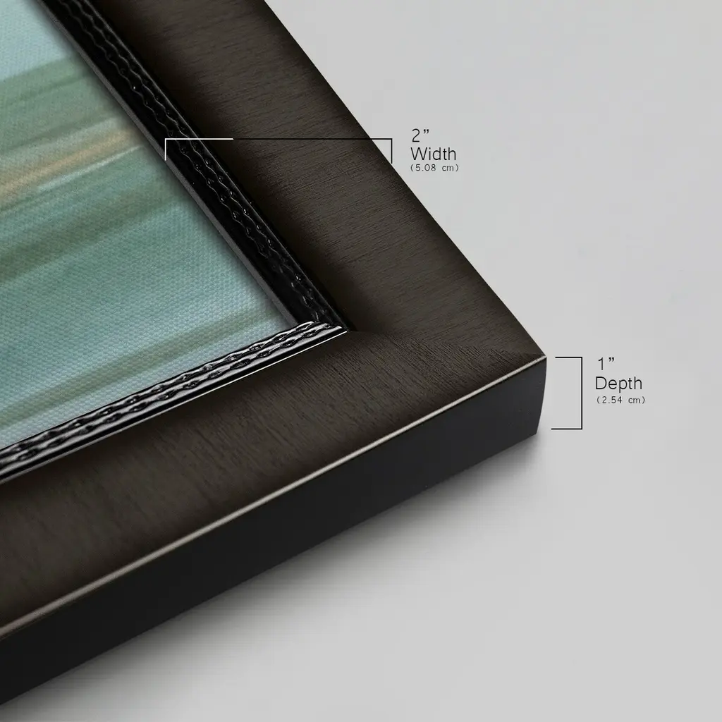 Aqua Reflections II Premium Framed Canvas- Ready to Hang A Premium Framed Canvas created to last. Framed in distressed wood and available in an array of sizes and colors Featuring a beveled a solid wood stretcher bar, each piece comes ready to hand 3 SIZES AVAILABLE 21''X37'' - Overall Size 25''X45'' - Overall Size 29''x53'' - Overall Size Each piece is made to order. Each piece comes with hanging hardware. Made in the USA Ready to Hang Giclee Paper Print Acrylic Glass Beveled Matt Board
