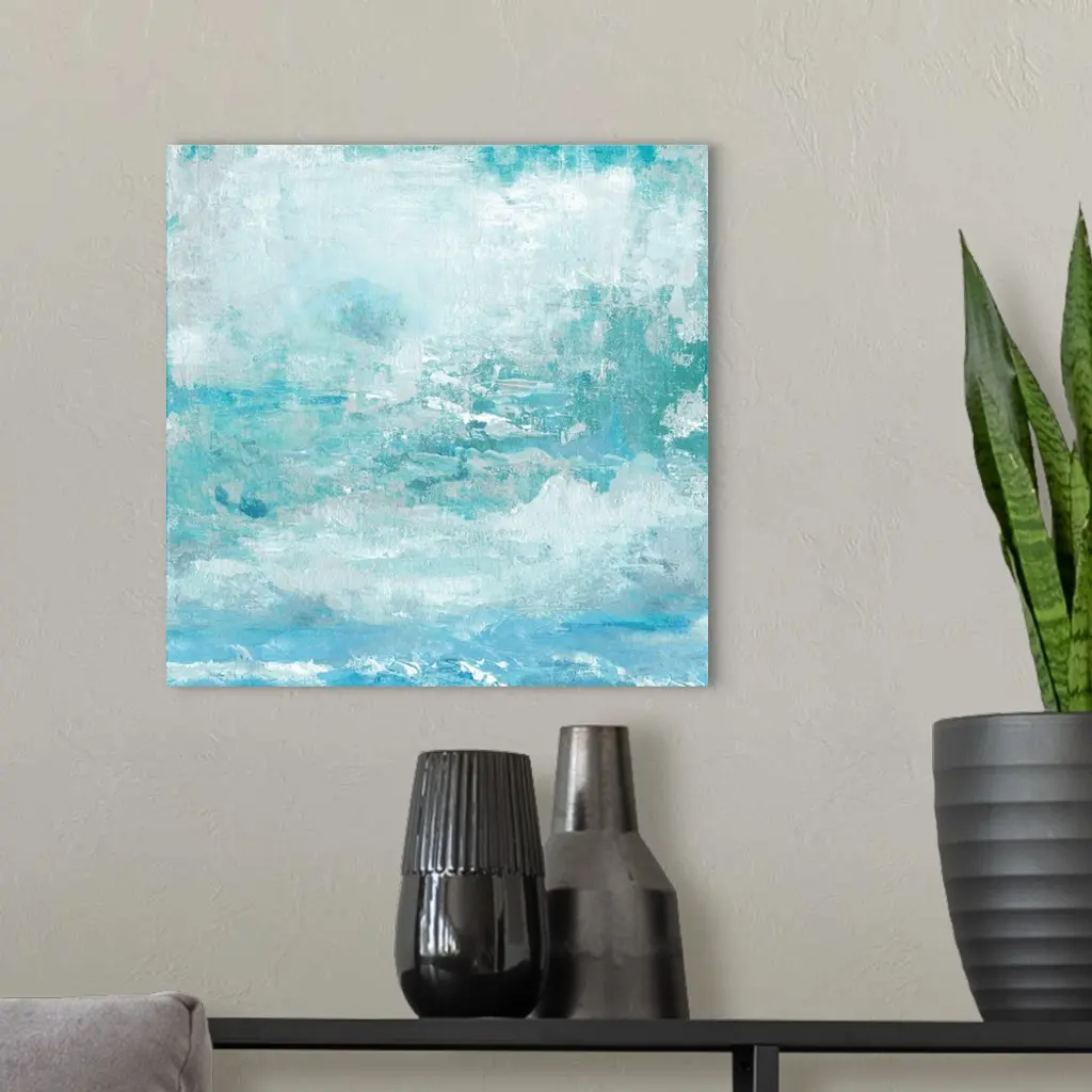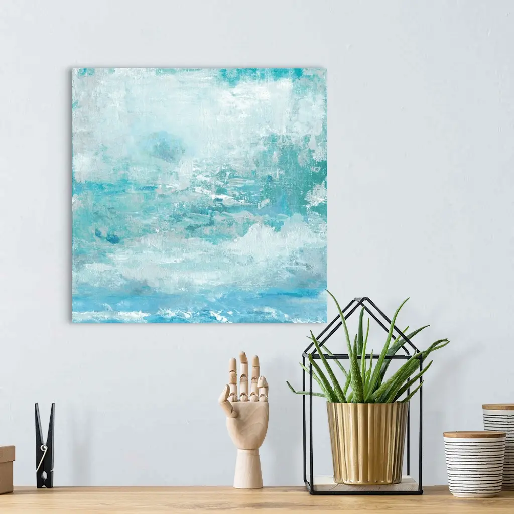 Contemporary abstract painting of a serene blue sky with clouds.