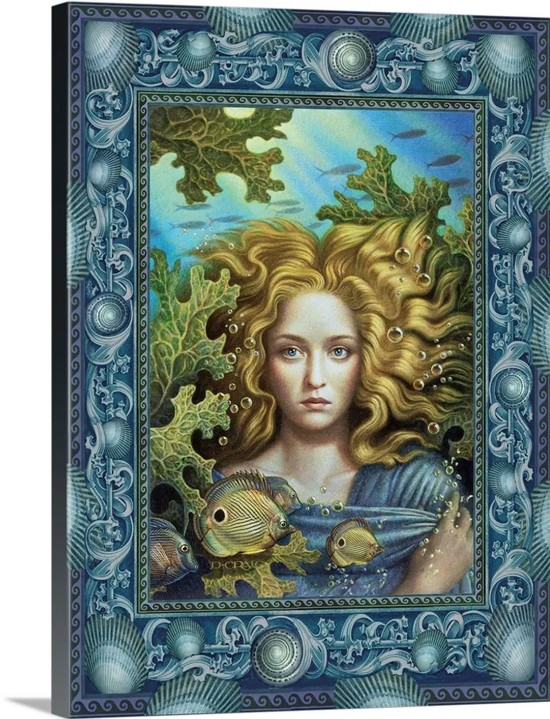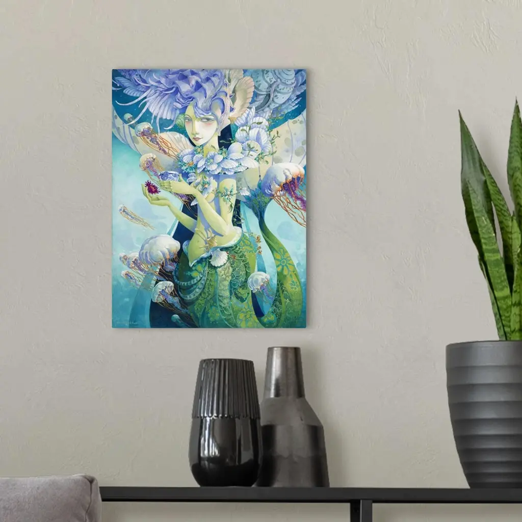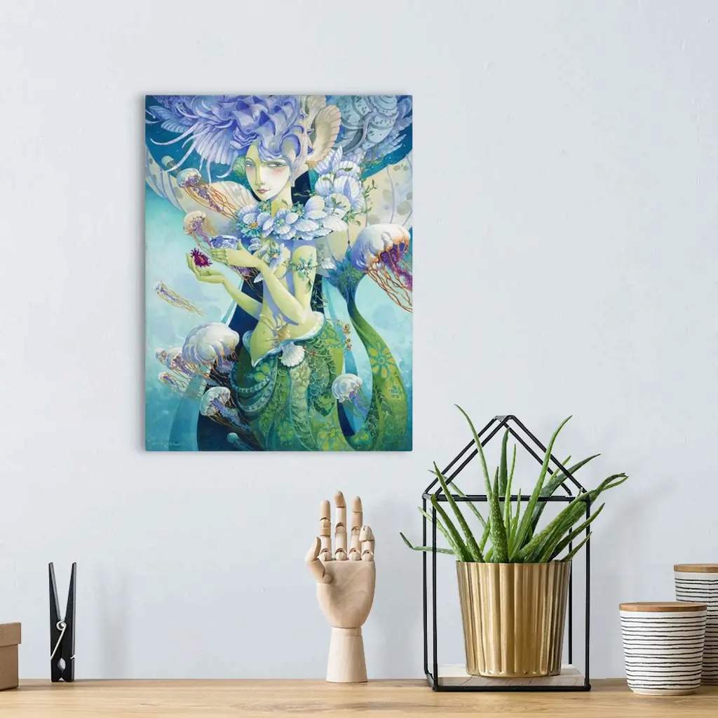 Contemporary artwork of a mermaid surrounded by jellyfish under the water.