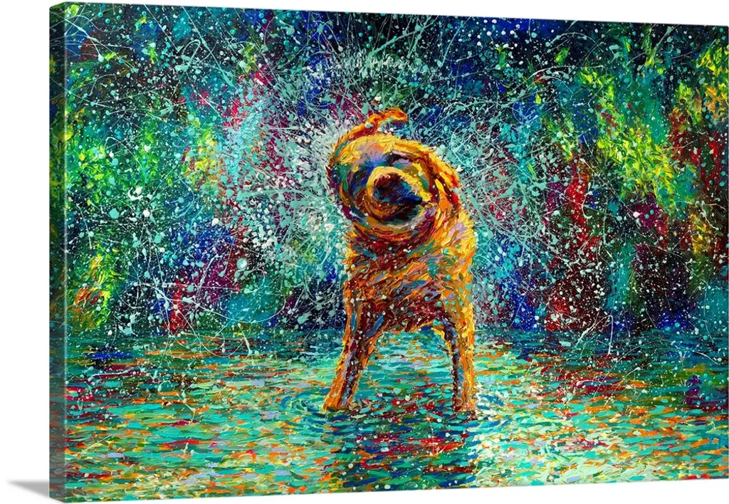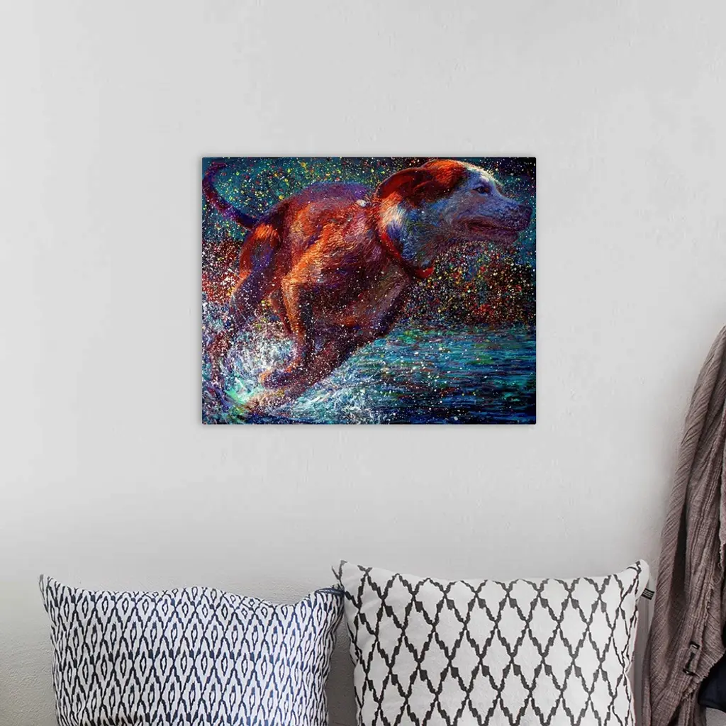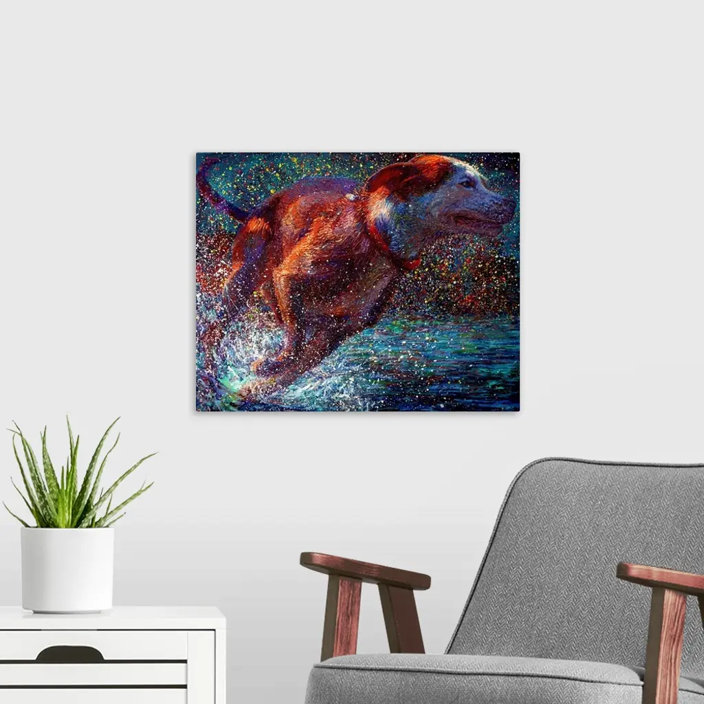 Brightly colored contemporary artwork of a dog running through water.