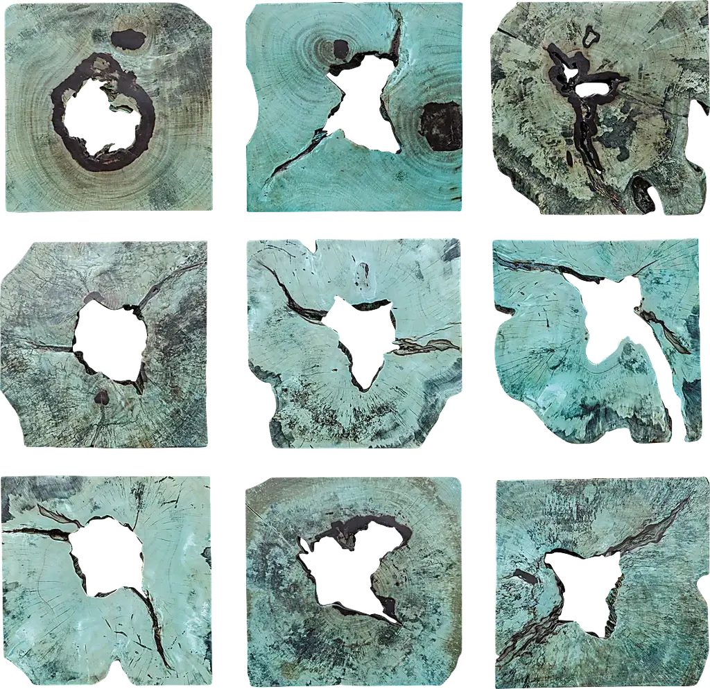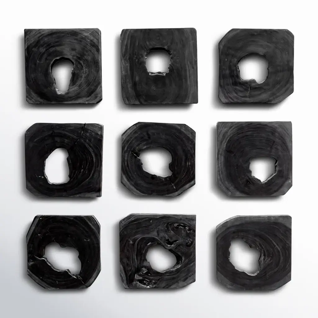 The Aramis set of nine wood wall pieces is crafted from 100% natural tamarind wood in a blue green finish. Because each is individually handcrafted, natural variation will occur from piece to piece.