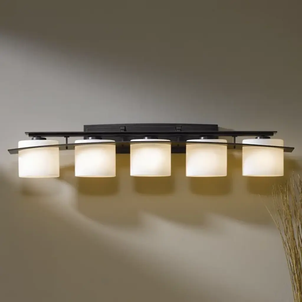 Part industrial, part modern. The Arc Ellipse Vanity Light by Hubbardton Forge brings a fresh, bold look to bathrooms, vanity counters, or spas. It features a series of cylindrical shades hand blown from opaque glasses. The shades are neatly arranged within the hand-forged wrought iron plate and supported with a matching bar. This damp-rated fixture is mounted to the wall with a rectangular backplate. When illuminated, the light is diffused through the shade to cast a warm, ambient glow.