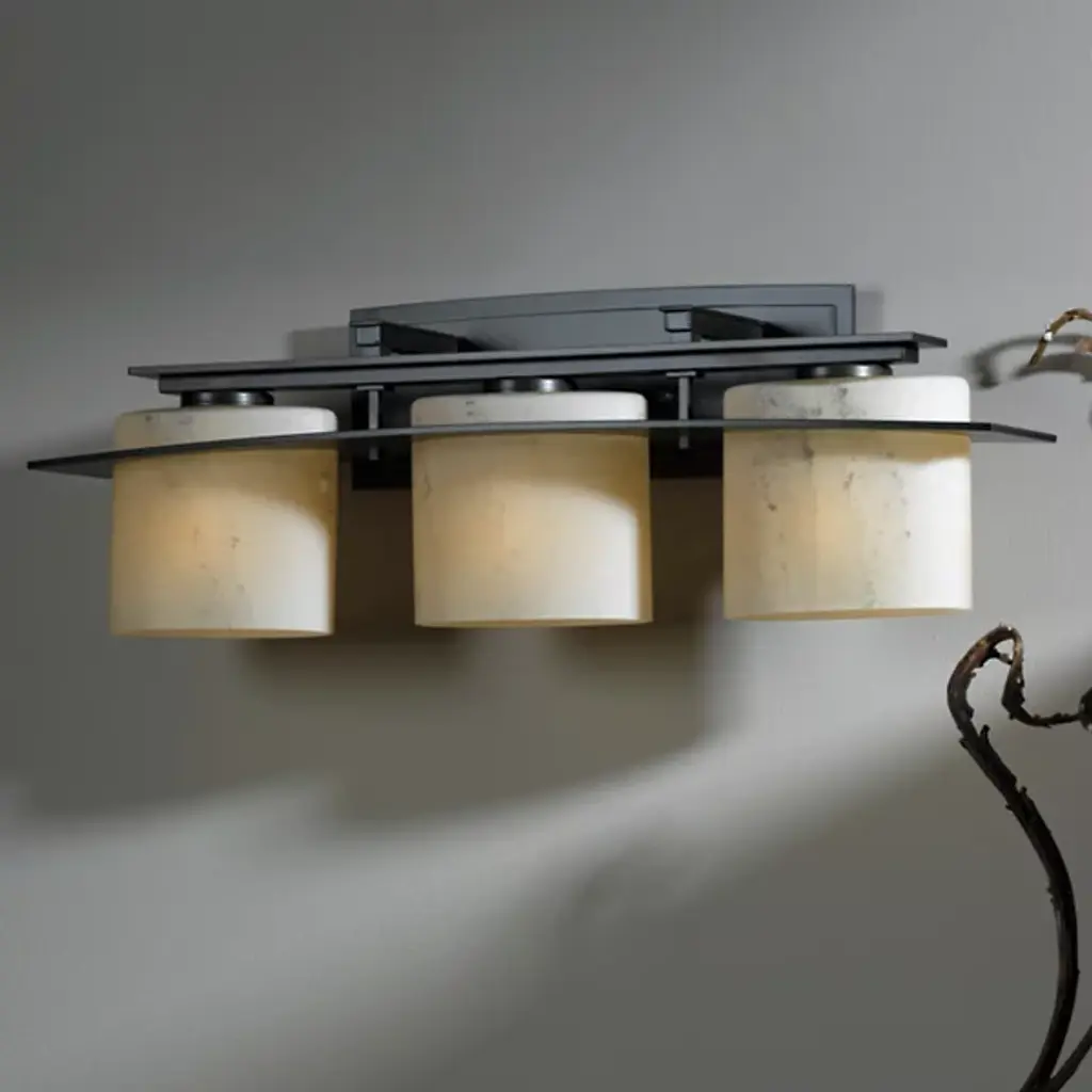 Part industrial, part modern. The Arc Ellipse Vanity Light by Hubbardton Forge brings a fresh, bold look to bathrooms, vanity counters, or spas. It features a series of cylindrical shades hand blown from opaque glasses. The shades are neatly arranged within the hand-forged wrought iron plate and supported with a matching bar. This damp-rated fixture is mounted to the wall with a rectangular backplate. When illuminated, the light is diffused through the shade to cast a warm, ambient glow.