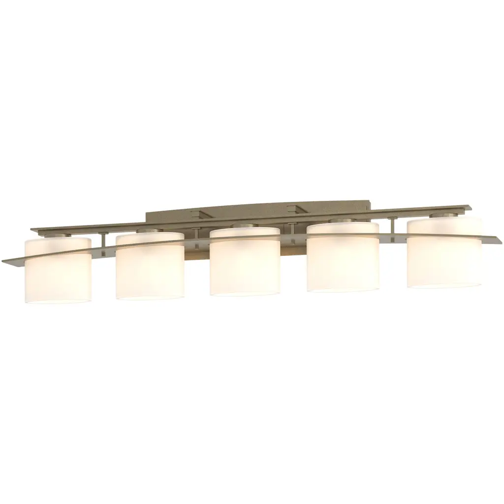 Part industrial, part modern. The Arc Ellipse Vanity Light by Hubbardton Forge brings a fresh, bold look to bathrooms, vanity counters, or spas. It features a series of cylindrical shades hand blown from opaque glasses. The shades are neatly arranged within the hand-forged wrought iron plate and supported with a matching bar. This damp-rated fixture is mounted to the wall with a rectangular backplate. When illuminated, the light is diffused through the shade to cast a warm, ambient glow.