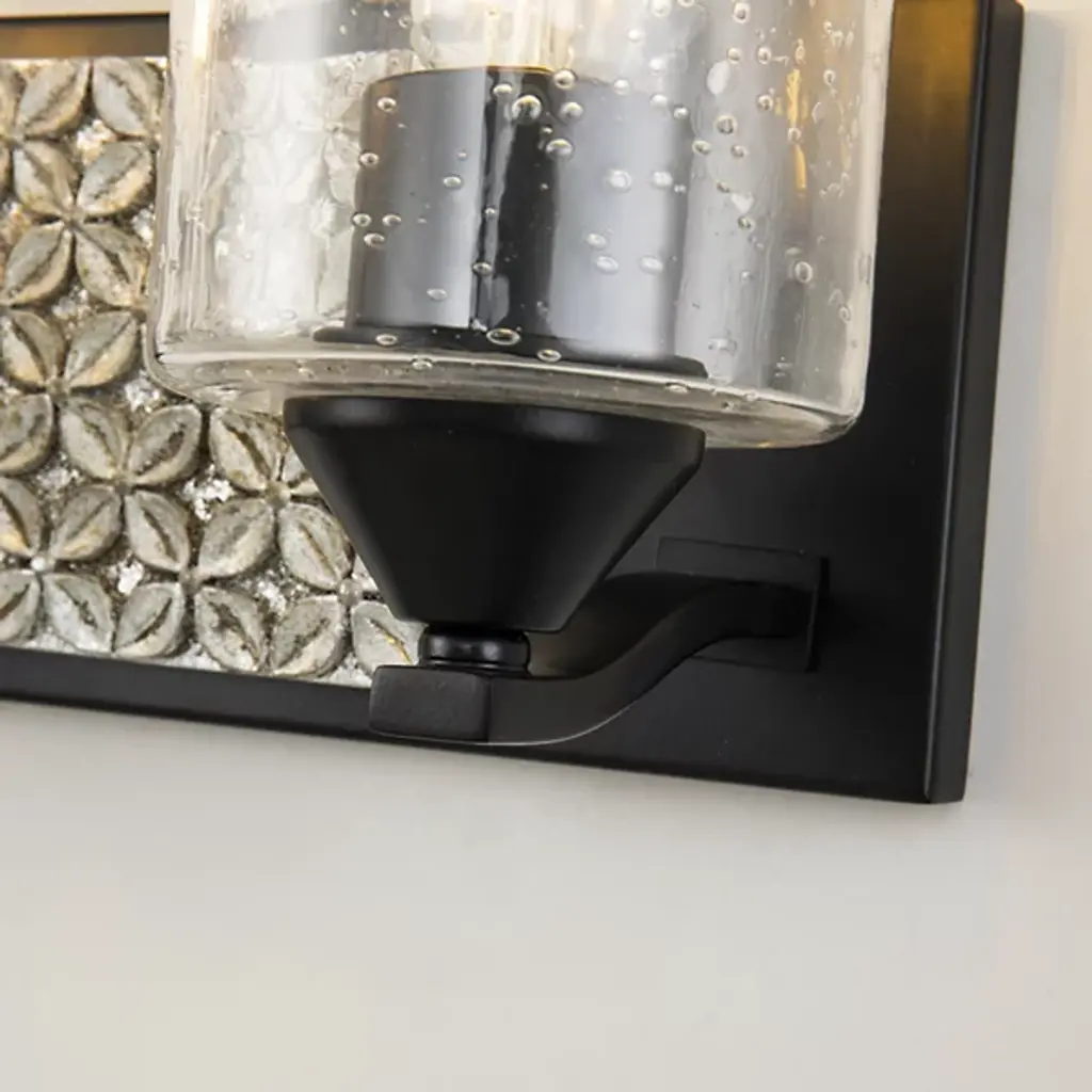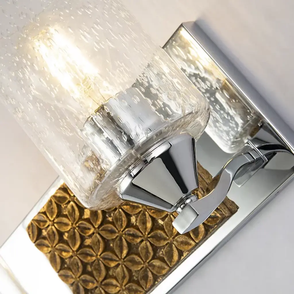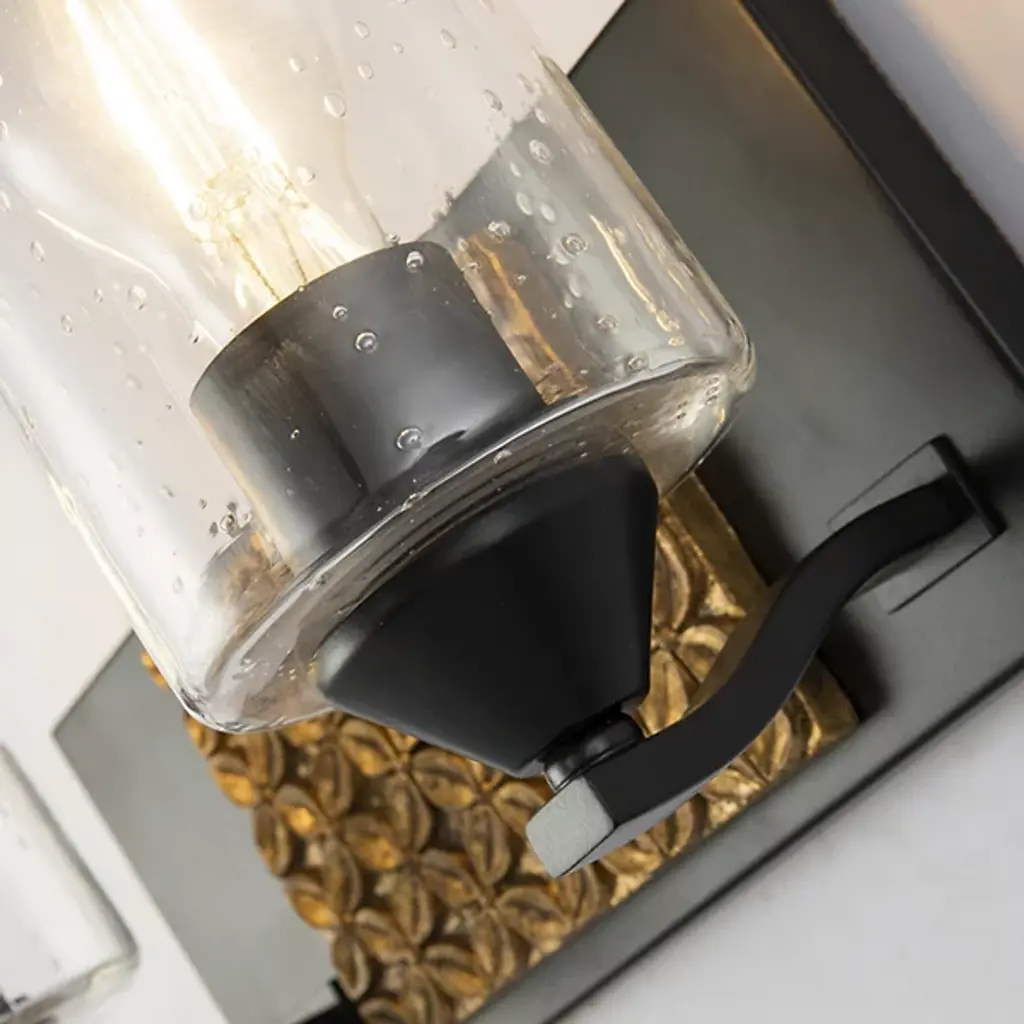 Made for brightening your hallway, bathroom, or living space, the Arcadia Vanity Light by Lucas McKearn features a clean-cut rectangle backplate with textured shapes and a simple curved arm. Showing off its contemporary side, this wall sconce uses a cylinder-shaped clear seeded glass to bring attention to the mix of texture and detail that come together seamlessly.