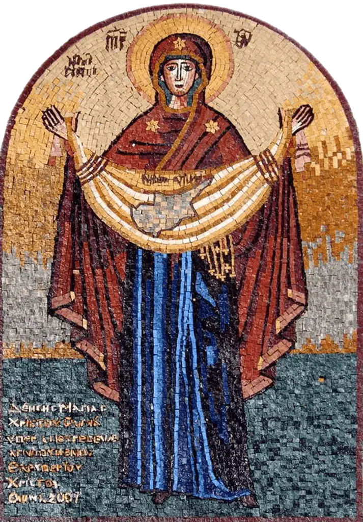 Introducing the Arched Shaped Ico Mary With Hands Wide Mosaic, a breathtaking religious artwork that brings grace and inspiration to any space. Crafted by skilled artisans, this stunning mosaic is made from all-natural marble, ensuring both quality and longevity. The intricate design portrays Mary with her hands wide open, symbolizing her loving compassion and blessing to the world. This powerful representation serves as a reminder of faith, hope, and the universal message of love that transcends boundaries. With its arched shape, the mosaic not only adds a spiritual touch but also enhances the aesthetic appeal of your environment.Perfect for placement on the walls of monasteries, churches, or living rooms, this piece creates a serene atmosphere that invites contemplation and reverence. Its elegant design seamlessly complements various interior styles, making it an ideal addition to your home decor or sacred spaces.This handmade mosaic is not just an ornament; it's a meaningful expression of devotion and artistry that connects us to our spiritual heritage. Each piece is unique, reflecting the artisan’s craftsmanship and the beauty of natural marble. Elevate your surroundings and inspire those around you with the Arched Shaped Ico Mary With Hands Wide Mosaic, a heartfelt tribute to the essence of love and blessing. Whether for personal use or as a thoughtful gift, this mosaic will be a cherished piece that enhances both interior decor and spiritual life. Bring home this extraordinary artwork today and experience the deep resonance of its message and beauty.