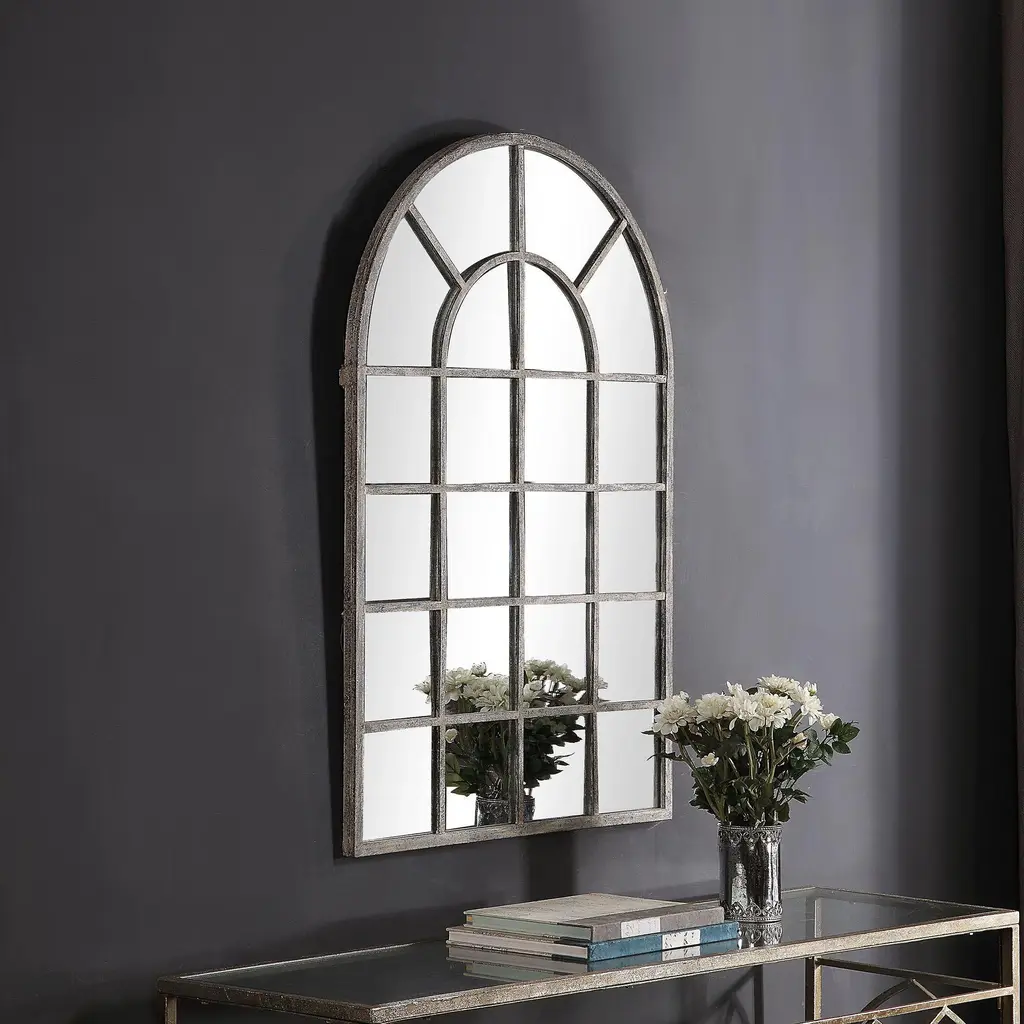 Finished in an antique rustic gray, this metal, arched windowpane frame will add interest to any space. Perfect for large walls, in a big entry to down a long wall. Also available in gold leaf here on our shop. Dimensions: 30 W X 44 H X 1 D (in) - Weight: 35 lbs Antique, vintage, designer floor samples & new products from one of the hottest Retail and To The Trade Home Furnishings showrooms in the country. Located in Chicago's chic Roscoe Village, Kenneth Ludwig Chicago carries the best offerings in furniture, accessories, artwork & textiles. Offerings are always fresh & always inspiring! Quite often ( due to a discontinued style, fabric or frame ) they must sell off their showroom floor samples. You receive first quality pieces at amazing prices. Check back weekly for new inventory added.