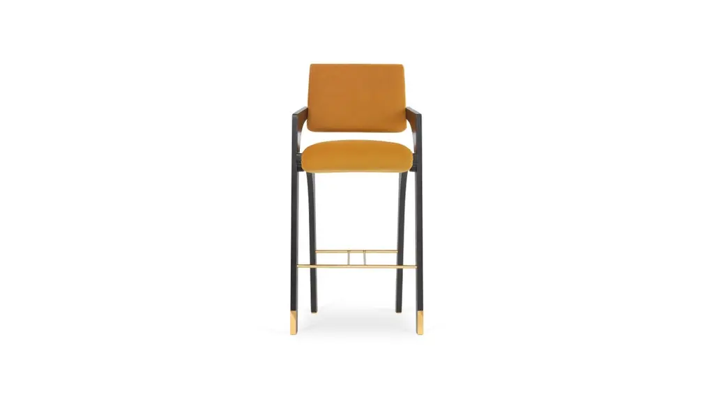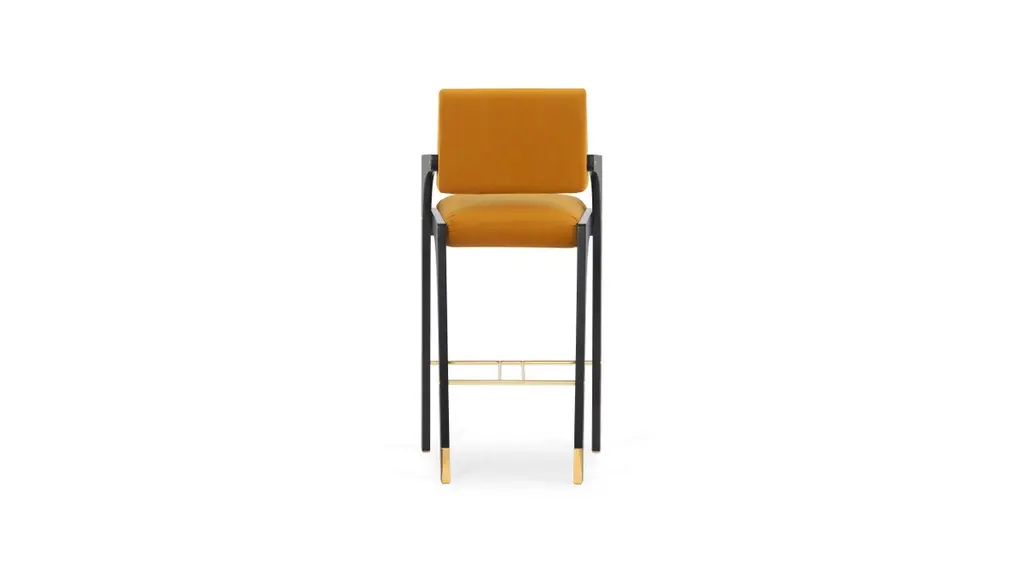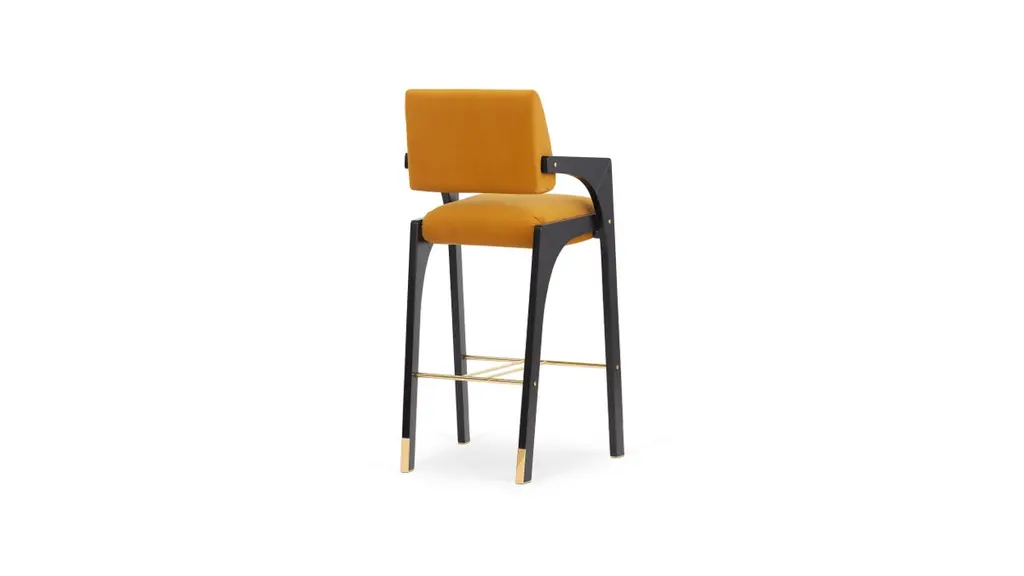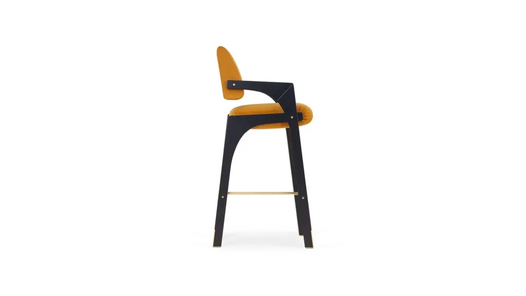 Arches Bar Stool by InsidherLandDimensions: D 57 x W 55 x H 112 cm.Materials: Black lacquered wood, polished brass, InsidherLand Smooth Velvet Ref. SMV 13 fabric.12 kg.Available in different fabrics.Since the Renaissance, many attempts have been made to develop ideal cities in which there would live perfect and sustainable communities. The new cities were planned in rational and geometric styles, trying to reflect the new habits and evolution of societies with the aim of improving the living conditions of its inhabitants. However, due to their complexity, the vast majority of them failed to transpose the theoretical idealizations of a utopian urbanism.The Arches bar stool is a redesign of the original dining chair. Suggesting the complexity of utopian cities, organized by the principles of symmetry and ideal forms, the profile shows details that seem to be drawn from large architectural structures. The raised backrest stands out from the remaining set that only crosses in a single point, whereas a folded brass bar arises as a support element that prevents the contact of the arches with the floor.Created by Architect Joana Santos Barbosa in 2012, InsidherLand is a Portuguese brand of exclusive design. Drawn with the signature of the creator, the impressive range of contemporary luxury furniture, lighting, upholstery and accessories are connected to her personal memories and have been highlighted for their innovative and soulful designs.Joana explores several influences from travels around the world to define her own Land as a place that allows her to translate her perceptions into objects of art.The essence of InsidherLand is presented by two inspiring collections. Beyond Memory Collection is deeply influenced by organic forms of nature, legends and traditional cultures, as for the Identity Collection is molded by forms of Architecture and Art. Both collections are designed as a dialog in which nature meets strong architectural lines to create relaxed and sophisticated interiors surrounded by natural materials and meaningful art pieces.Being positioned in strategic markets of high-end luxury decoration, InsidherLand team is proud of working with the best architects and interior design studios from all over the world who seek for handmade exclusive objects that arouse emotions and stand out in exquisite spaces.We are dedicated with love and enthusiasm into every creation to surprise a sensitive but demanding public. Using the expertise of traditional craft techniques, all creations are made by the hands of Portuguese master craftsmen and jewelers who wisely sculpt them in noble materials, finalizing every detail with elegance and perfection.