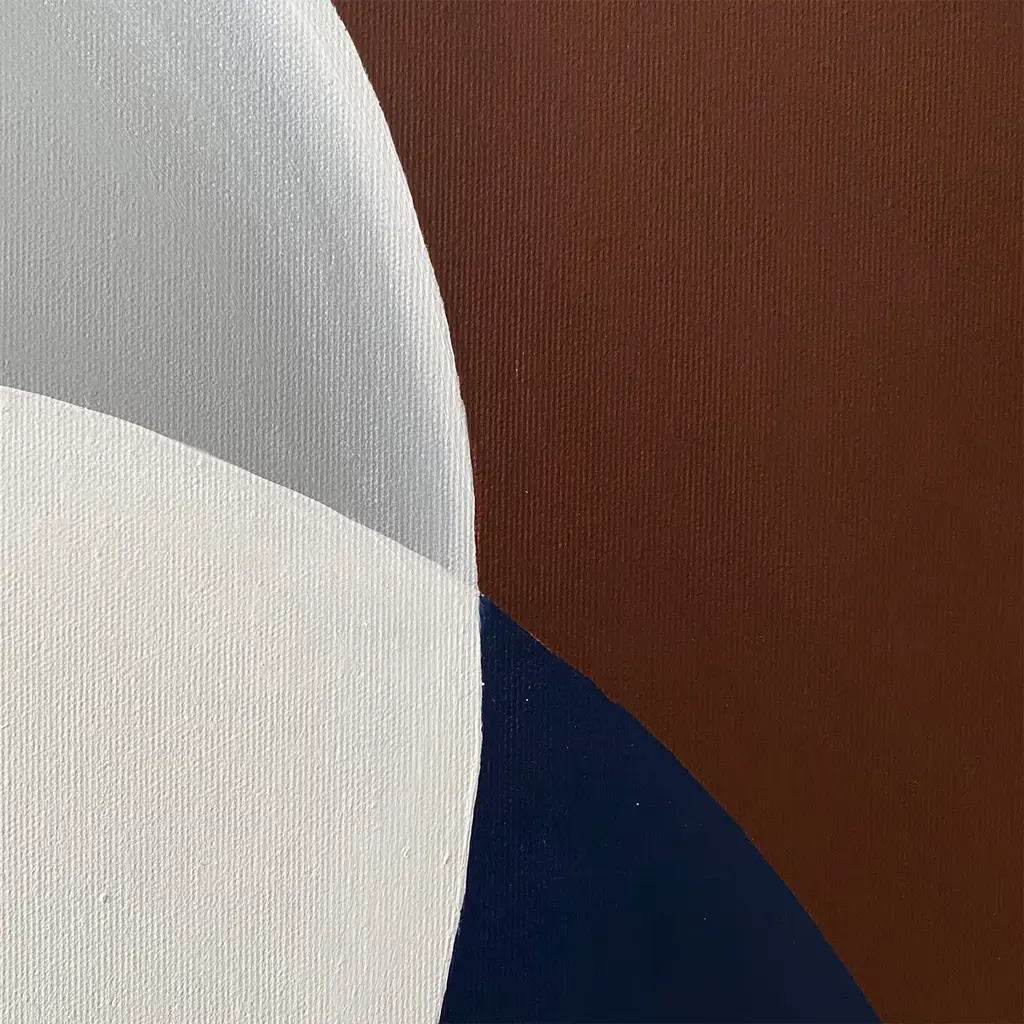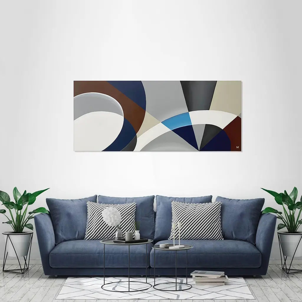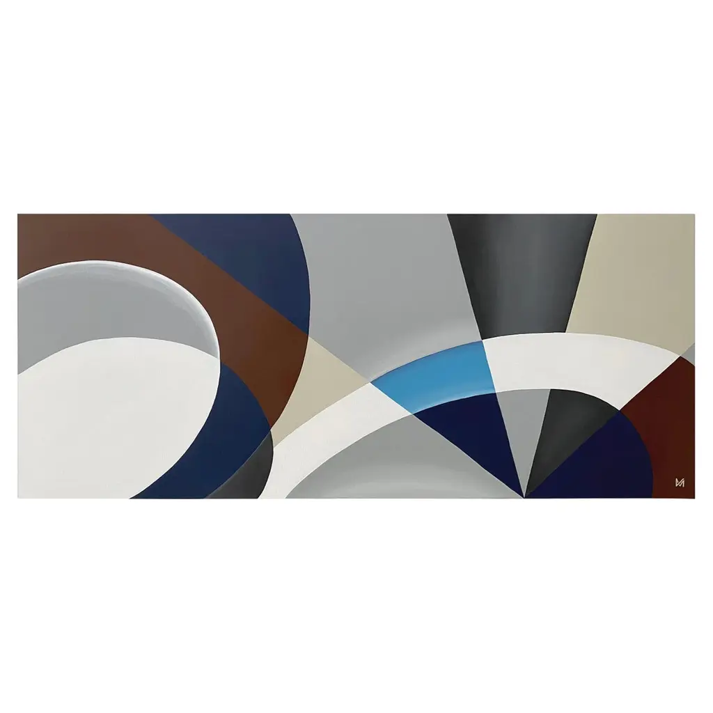 Bridges, squares, streets, gates: Marzia Boaglio captures the majesty of Turin in this painting, homaging a city defined by its succession of arches and arcades that frame its beauty. This artwork captures the city's dynamism with its silvery, white and brown tones, bringing a magical atmosphere into your home. A single blue patch in the middle of the composition recalls the blue sky, as if it were peaking through the urban fabric of the city.