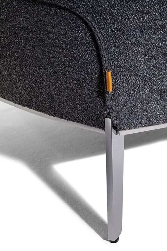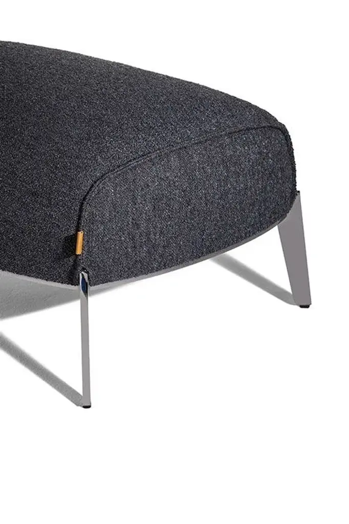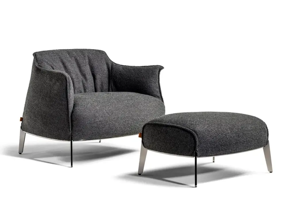 Archibald is a fabric upholstered footstool, to be combined with the Archibald Grand Comfort armchair designed by Jean-Marie Massaud for Poltrona Frau.Made from beech, the seat of the Archibald Gran Comfort armchair has springs consisting of elastic belts. These return, as an additional source of comfort, along the perimeter of the steel-framed backrest. The seat and backrest padding, in quilted goose-down baffle, makes the armchair even softer. The removable upholstery is in Pelle Frau® Safari leather. The trim around the edge of the upholstery is embellished with hand-painted raw cut leather and finished with tone-on-tone or contrast stitching. The steel base and feet have a Ruthenium finish. Ultra-thin and light, the feet almost seem to be sketched by pencil. The soft Archibald Gran Comfort pouf is the natural complement to the armchair.
