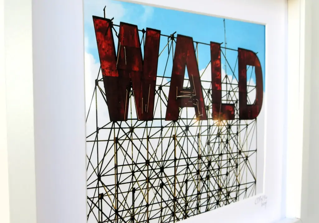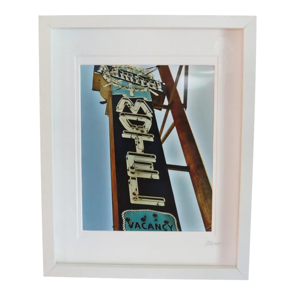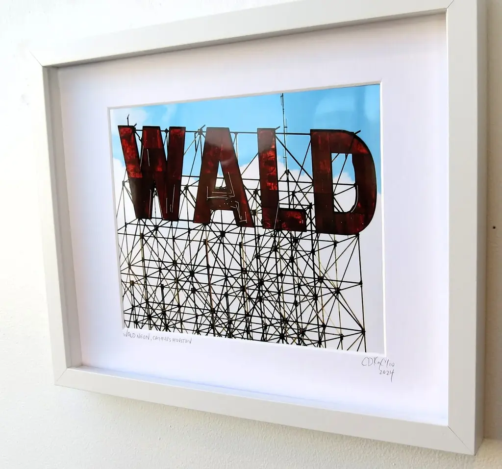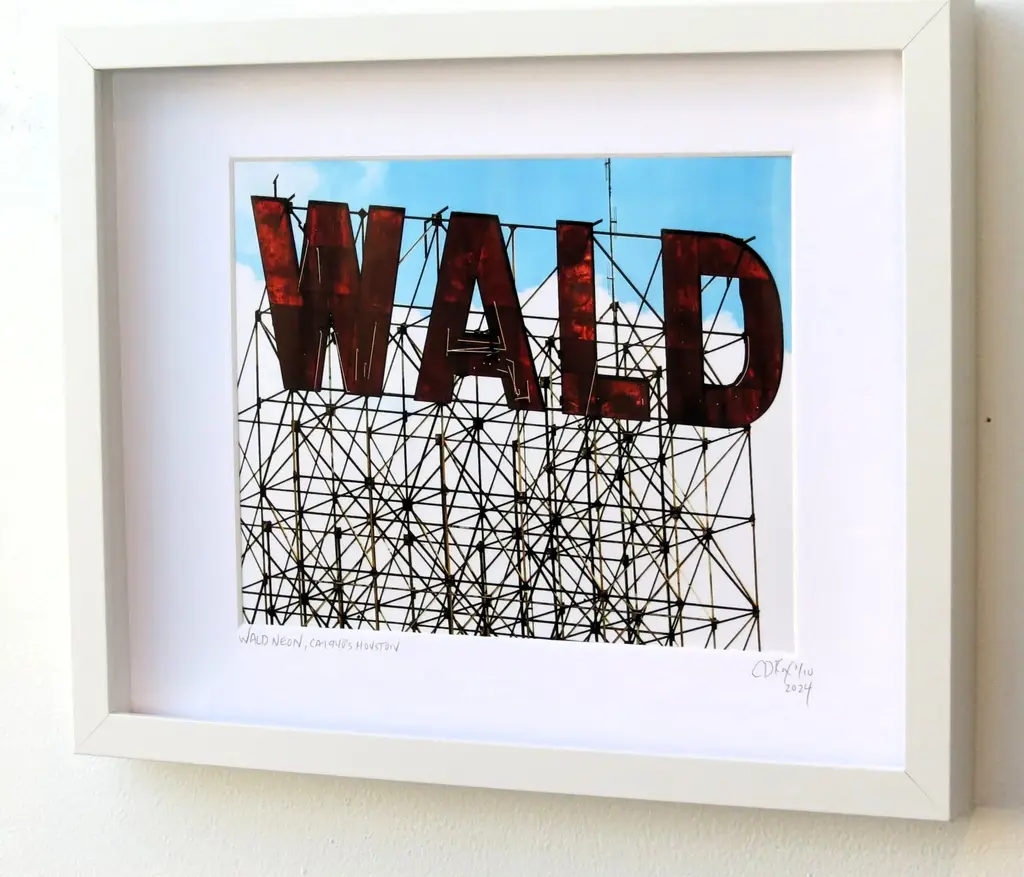 Digitally enhanced framed Limited Edition photography of the Iconic and beloved Houston East End Landmark Neon Signage at WALD Storage, Ca. 1940's Vintage style color digital filter adds a unique dimension to this Limited Edition Travel and Architectural photography framed and matted under glass. 12" x 15". Size matted at 11" x 14", image is 10" x 14". Signed, dated, and numbered. White modern frame with backing and hanging hardware attached.