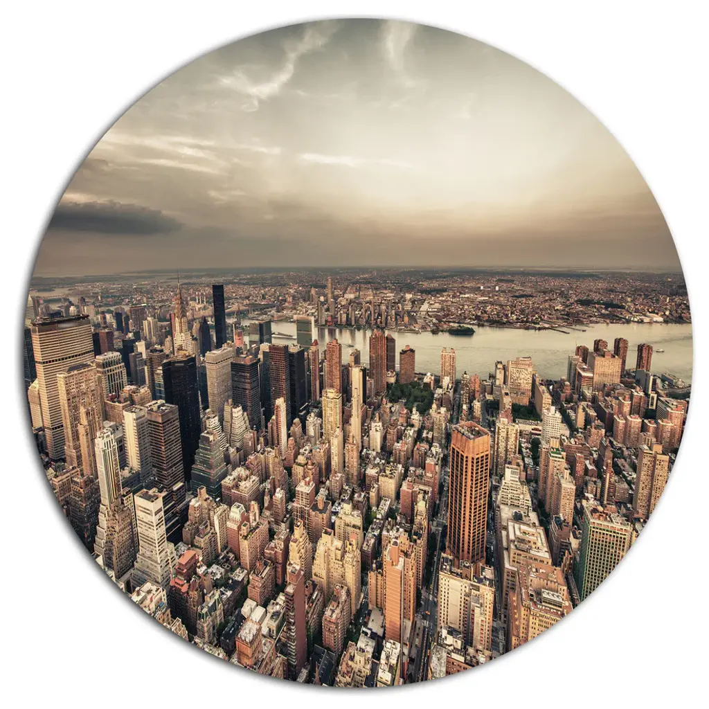 Bring Contemporary Abstraction to your home with this large Circle Metal wall art. This Architecture and Colors of New York Metal Artwork makes it the focal point of any room or office. - White Gloss Coating ensures colors are extra vibrant with light reflection.- Aluminum grade Sheet Metal with 1 inch mounting frame on the back giving the illusion that the artwork is floating on the wall..- Mounting Brackets are included along with instructions.- High Quality Digital images are created directly into a glossy aluminum panel producing a stunning and captivating print into the glossy finish of the metal.- Water, Fire and Scratch resistant HD Aluminum panels.- Looks better than any photo paper and guaranteed to last at least 20 years- Easy to clean with a microfiber cloth. Colors are far superior to regular Canvas Art. - Easy to Hang