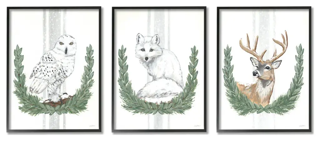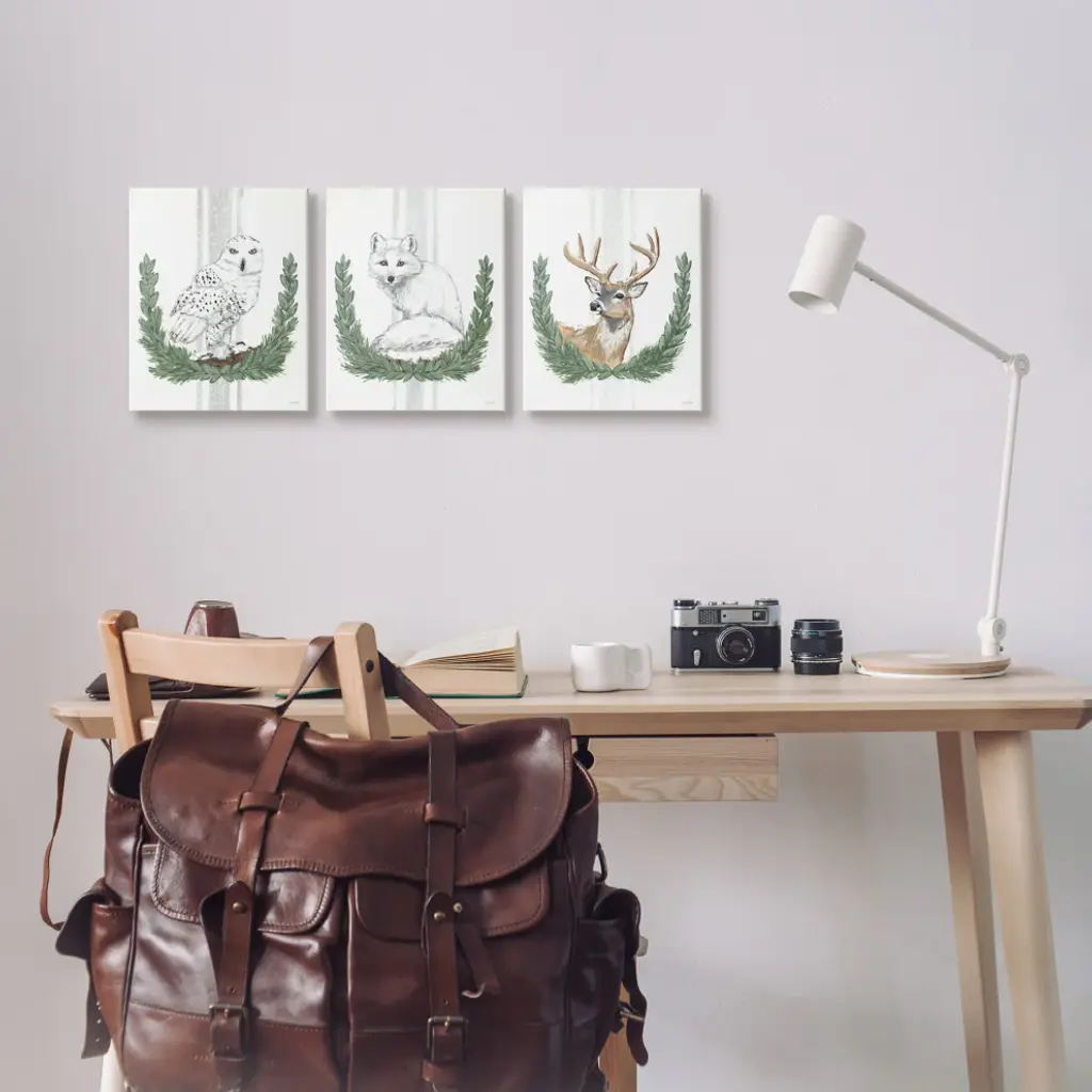 Arctic Animals Botanical Leaves Portrait Snowy Owl Deer Fox, 3Pc, Each 11 X 14