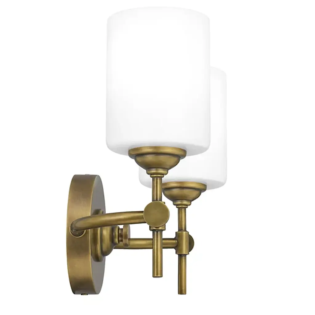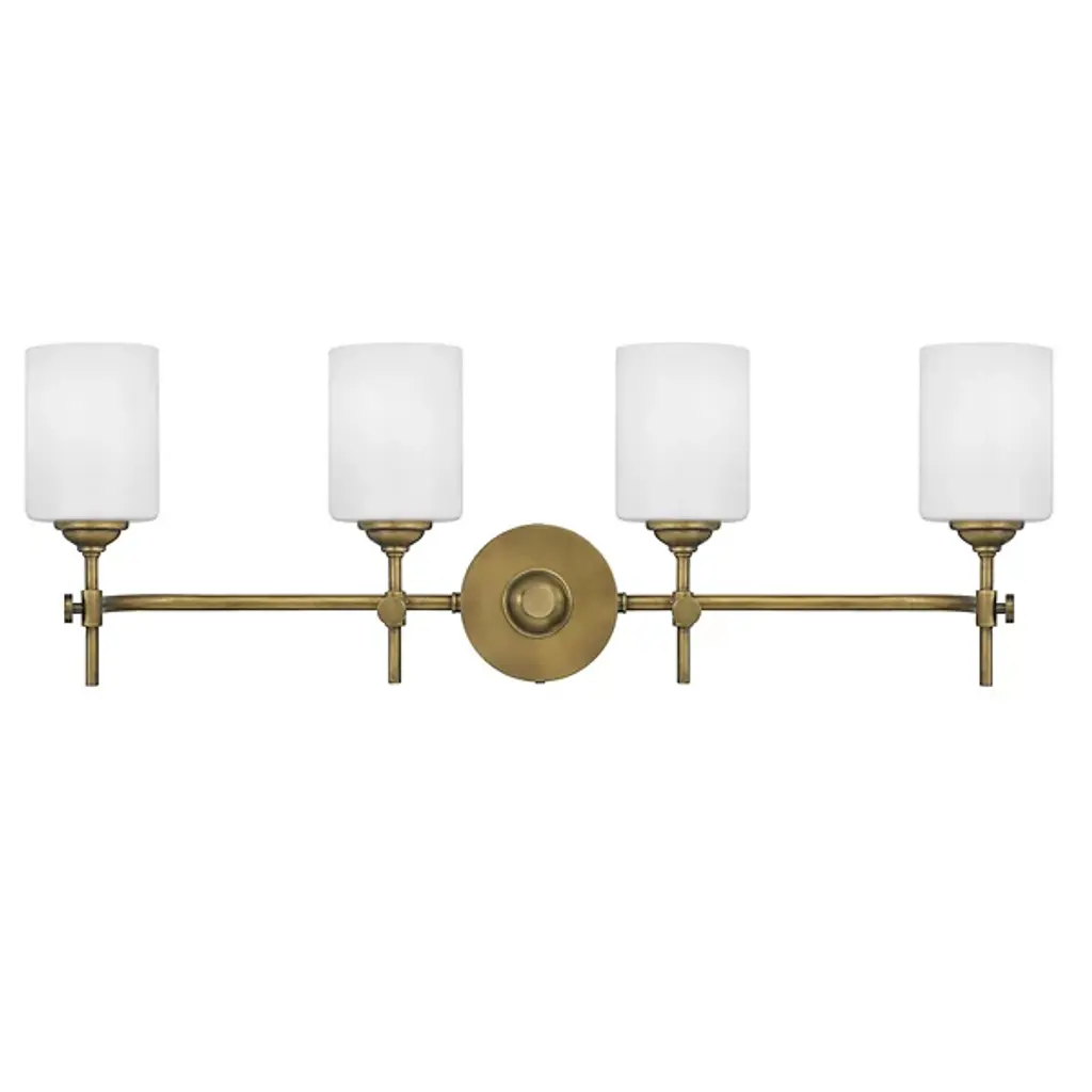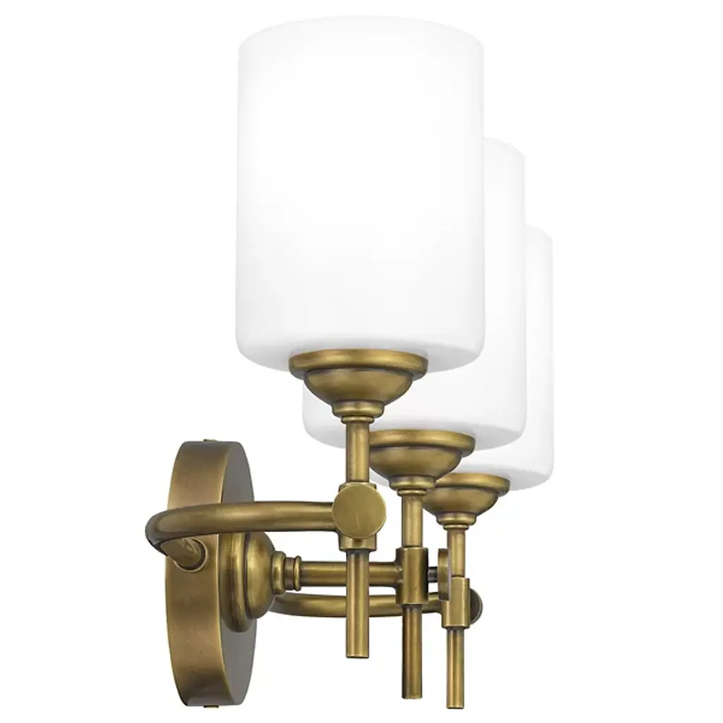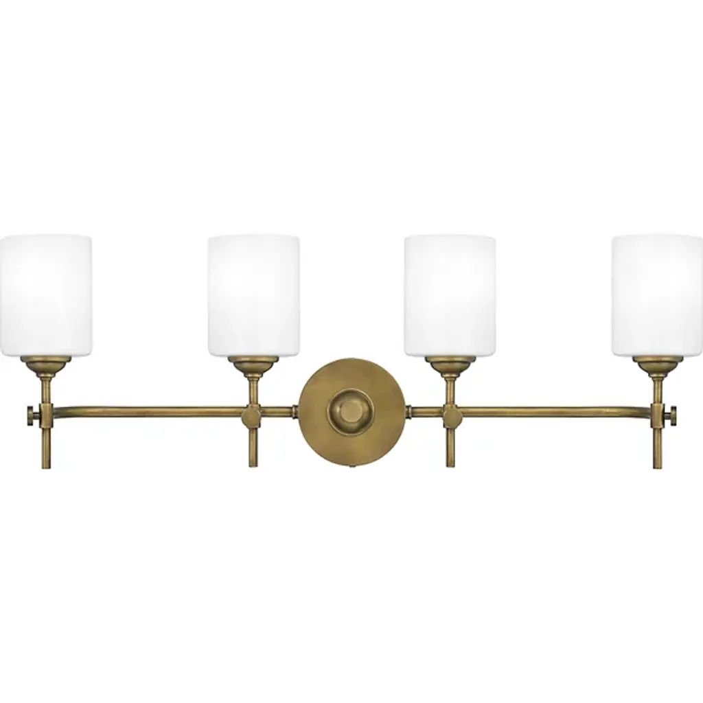 The Aria Vanity Light by Quoizel infuses a space with warmth through its retro style and soft light. Evoking a subtle mid-century modern quality, its circular wall mount supports a series of slender arms that hold vertical stems. Each stem is topped with a circular socket and a cylindrical shade crafted from opal etched glass—each one glowing warmly from a concealed bulb. Knob details impart a vintage accent that lends character and charm, while its weathered finish adds to its warm aesthetic.