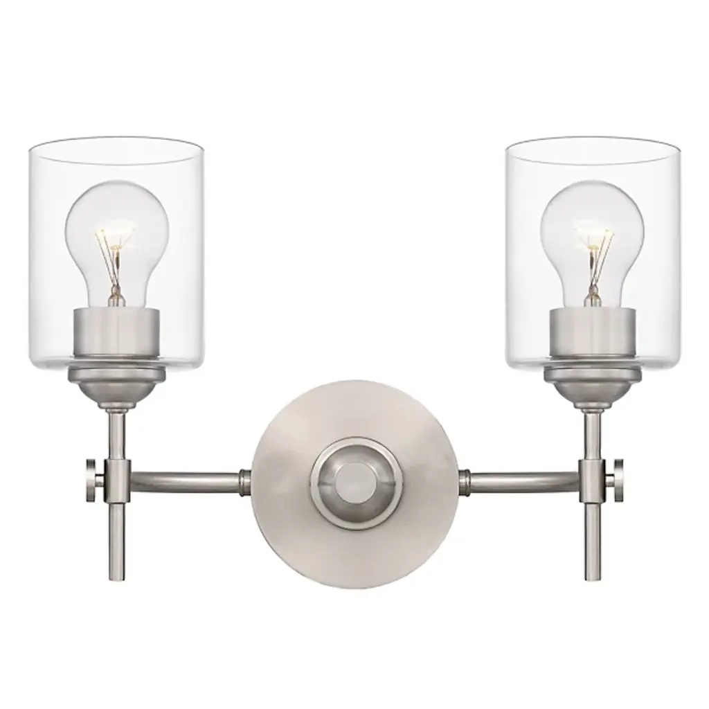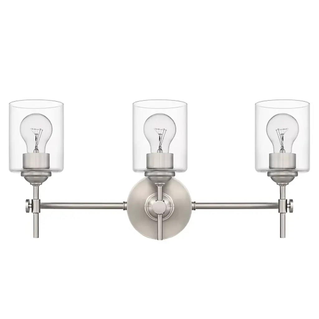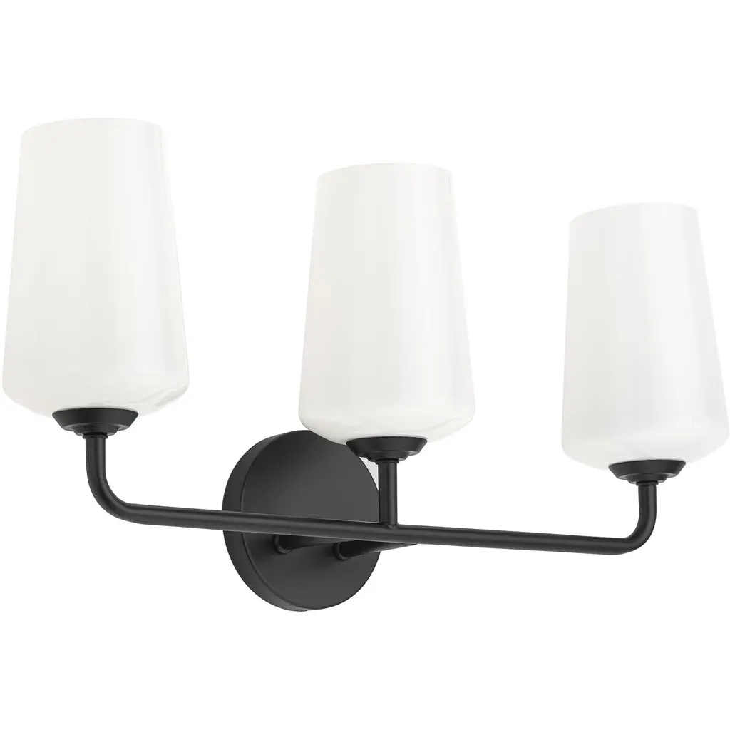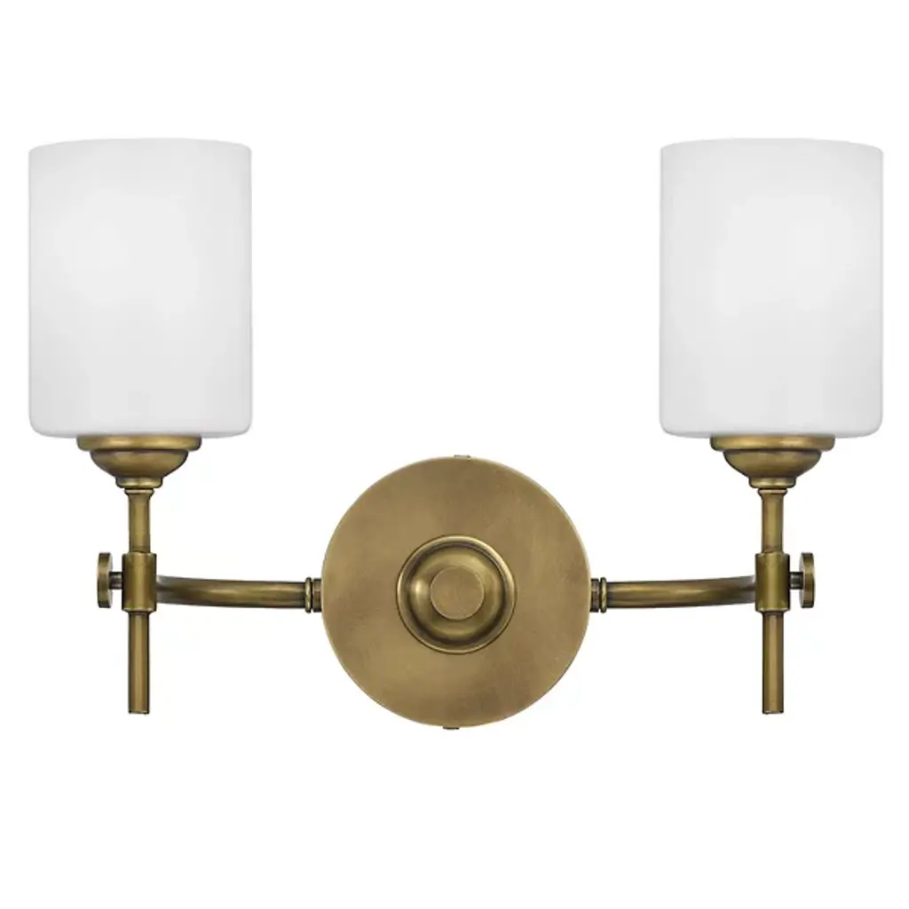 The Aria Vanity Light by Quoizel infuses a space with warmth through its retro style and soft light. Evoking a subtle mid-century modern quality, its circular wall mount supports a series of slender arms that hold vertical stems. Each stem is topped with a circular socket and a cylindrical shade crafted from opal etched glass—each one glowing warmly from a concealed bulb. Knob details impart a vintage accent that lends character and charm, while its weathered finish adds to its warm aesthetic.