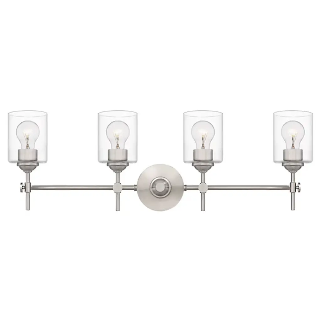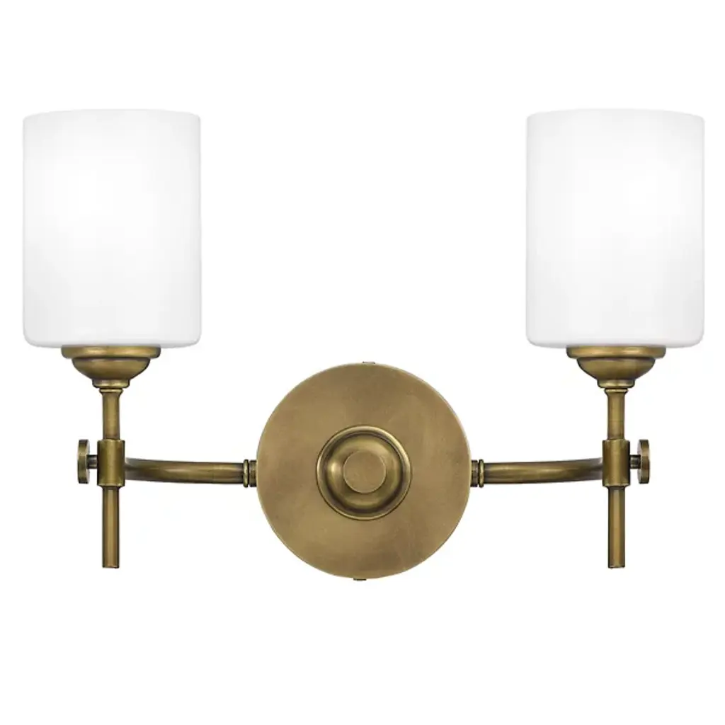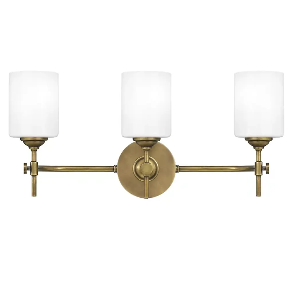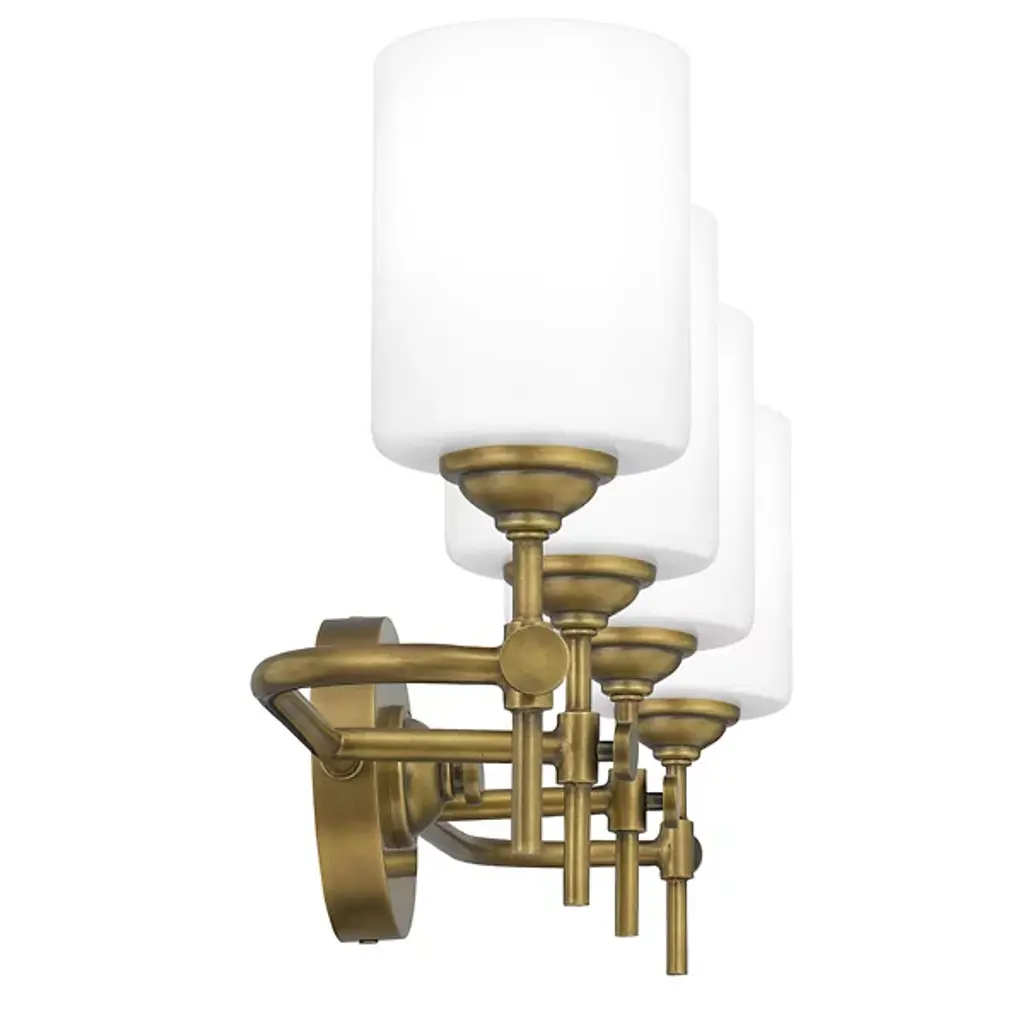 The Aria Vanity Light by Quoizel infuses a space with warmth through its retro style and soft light. Evoking a subtle mid-century modern quality, its circular wall mount supports a series of slender arms that hold vertical stems. Each stem is topped with a circular socket and a cylindrical shade crafted from opal etched glass—each one glowing warmly from a concealed bulb. Knob details impart a vintage accent that lends character and charm, while its weathered finish adds to its warm aesthetic.