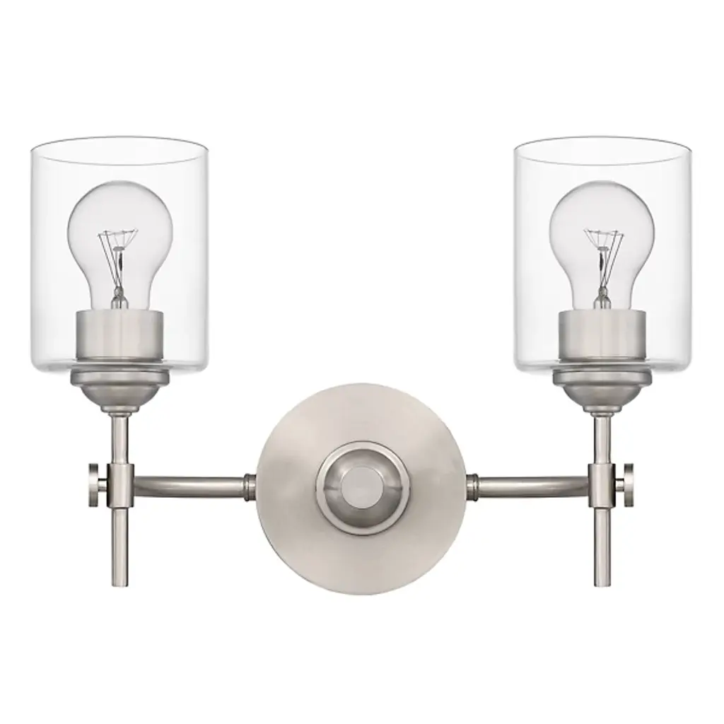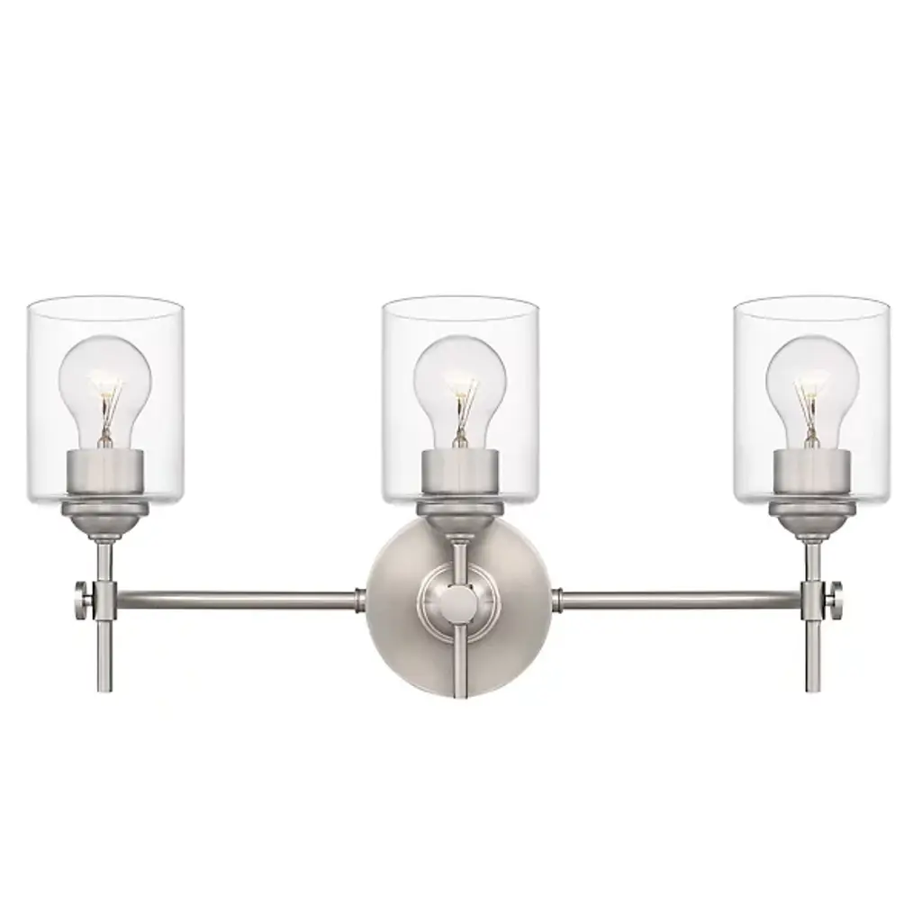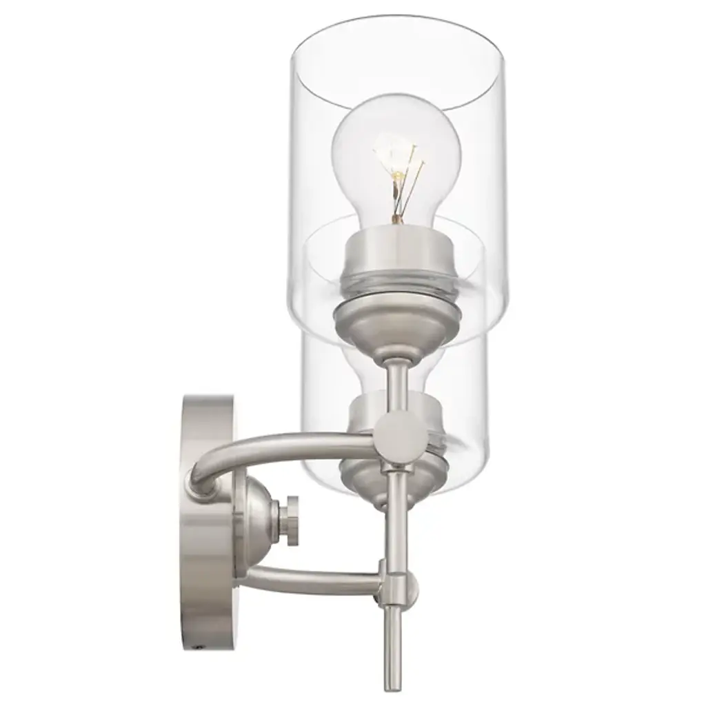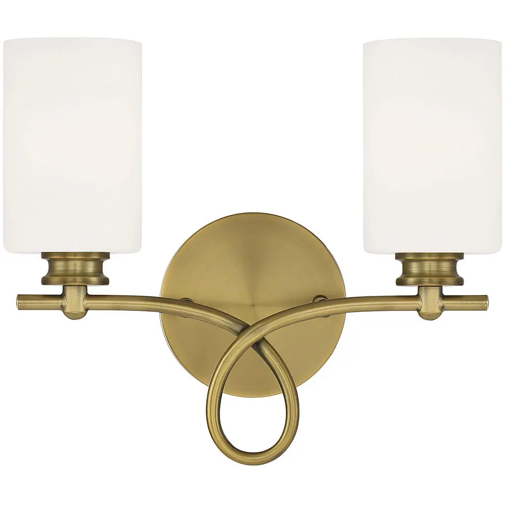 The Aria Vanity Light by Quoizel infuses a space with warmth through its retro style and soft light. Evoking a subtle mid-century modern quality, its circular wall mount supports a series of slender arms that hold vertical stems. Each stem is topped with a circular socket and a cylindrical shade crafted from opal etched glass—each one glowing warmly from a concealed bulb. Knob details impart a vintage accent that lends character and charm, while its weathered finish adds to its warm aesthetic.