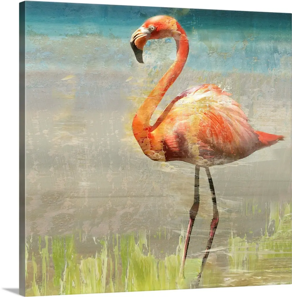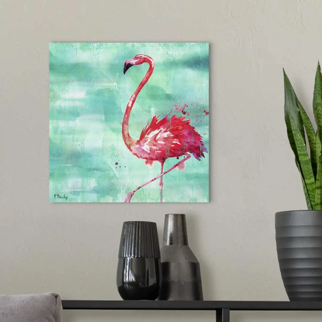 Square watercolor painting of a pink flamingo on a blue and green background with pink paint splatter.