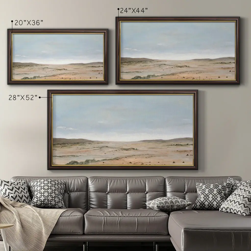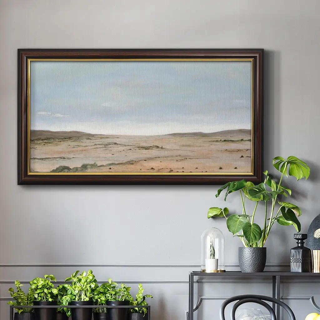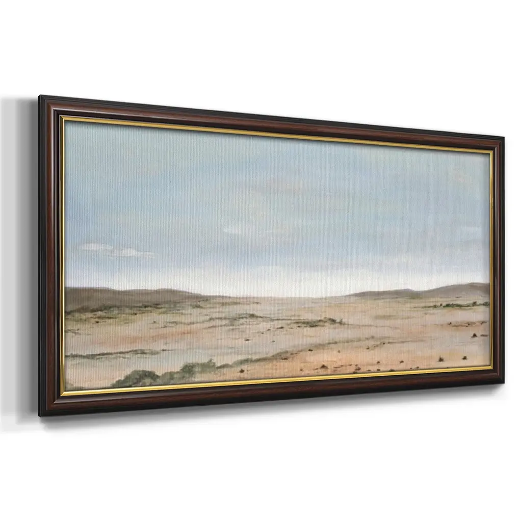 Arid Vista II Premium Framed Canvas- Ready to Hang A Premium Framed Canvas created to last. Framed in distressed wood and available in an array of sizes and colors Featuring a beveled a solid wood stretcher bar, each piece comes ready to hand 3 SIZES AVAILABLE 21''X37'' - Overall Size 25''X45'' - Overall Size 29''x53'' - Overall Size Each piece is made to order. Each piece comes with hanging hardware. Made in the USA Ready to Hang Giclee Paper Print Acrylic Glass Beveled Matt Board