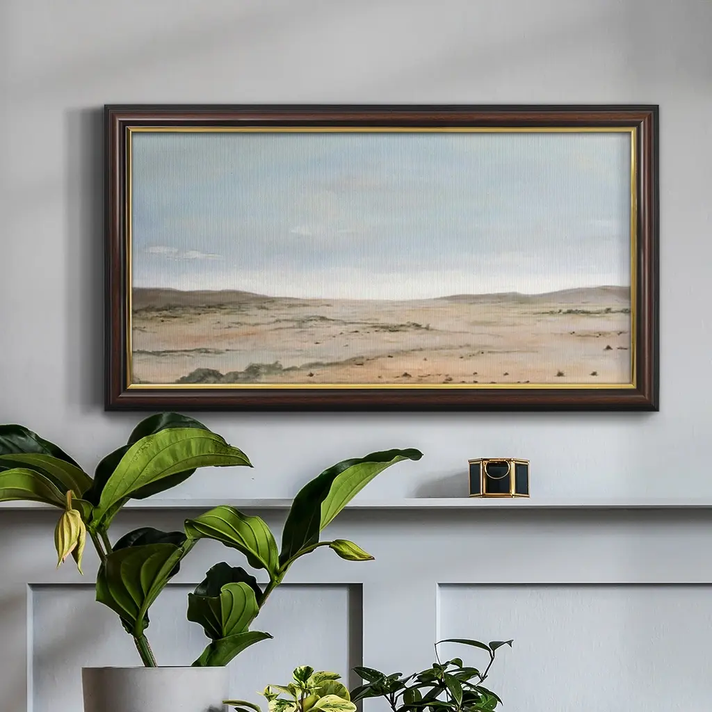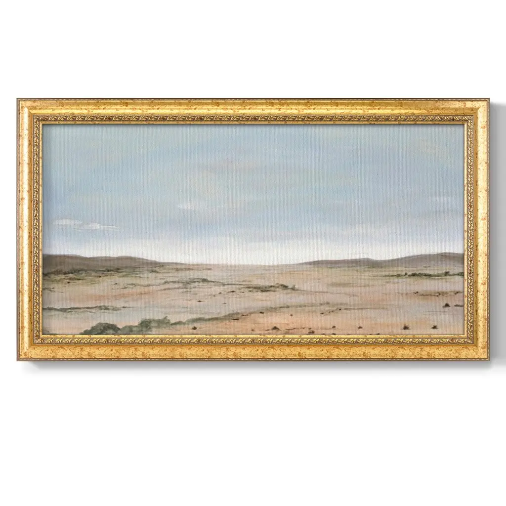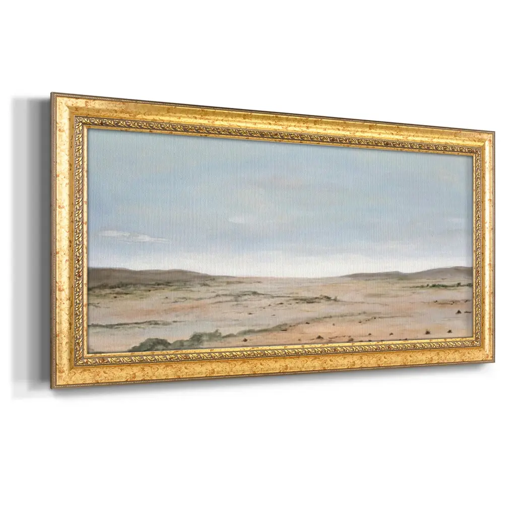 Arid Vista II Premium Framed Canvas- Ready to Hang A Premium Framed Canvas created to last. Framed in distressed wood and available in an array of sizes and colors Featuring a beveled a solid wood stretcher bar, each piece comes ready to hand 3 SIZES AVAILABLE 21''X37'' - Overall Size 25''X45'' - Overall Size 29''x53'' - Overall Size Each piece is made to order. Each piece comes with hanging hardware. Made in the USA Ready to Hang Giclee Paper Print Acrylic Glass Beveled Matt Board