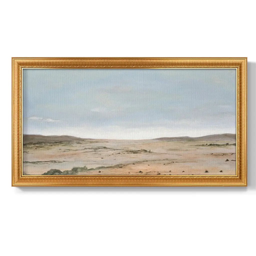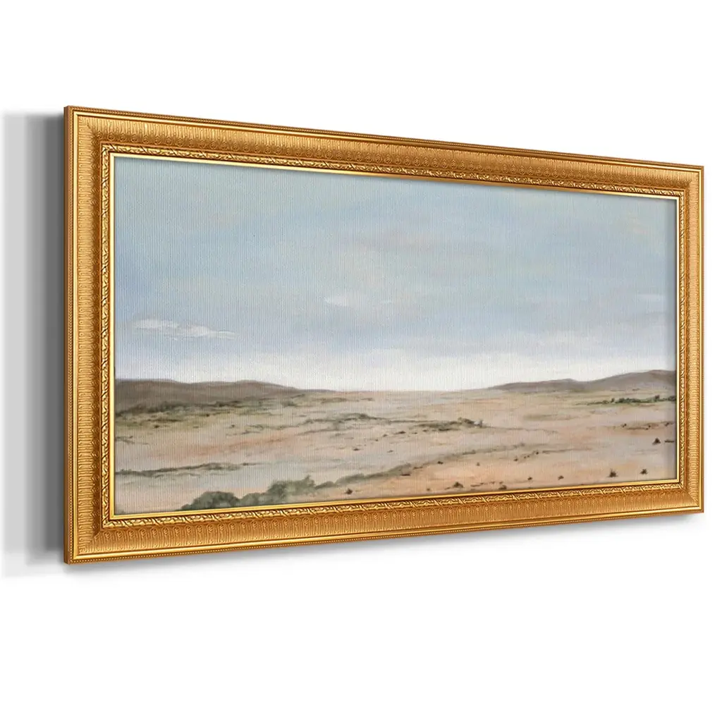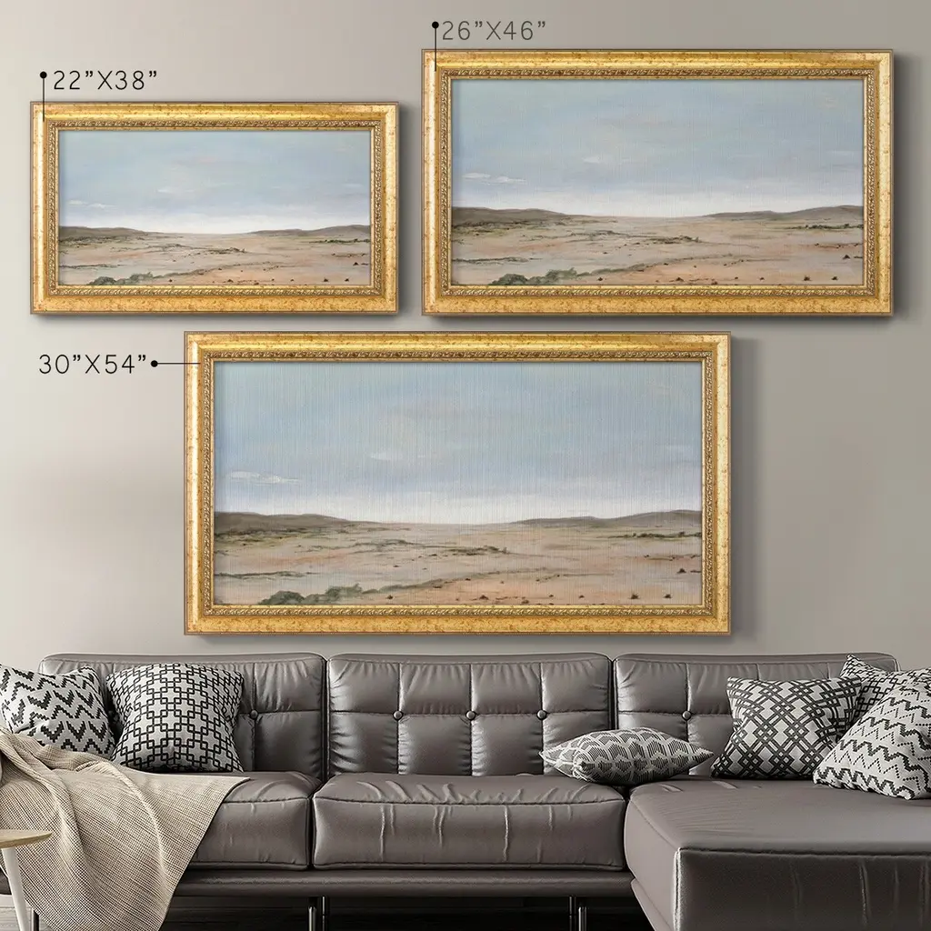 Arid Vista II Premium Framed Canvas- Ready to Hang A Premium Framed Canvas created to last. Framed in distressed wood and available in an array of sizes and colors Featuring a beveled a solid wood stretcher bar, each piece comes ready to hand 3 SIZES AVAILABLE 21''X37'' - Overall Size 25''X45'' - Overall Size 29''x53'' - Overall Size Each piece is made to order. Each piece comes with hanging hardware. Made in the USA Ready to Hang Giclee Paper Print Acrylic Glass Beveled Matt Board