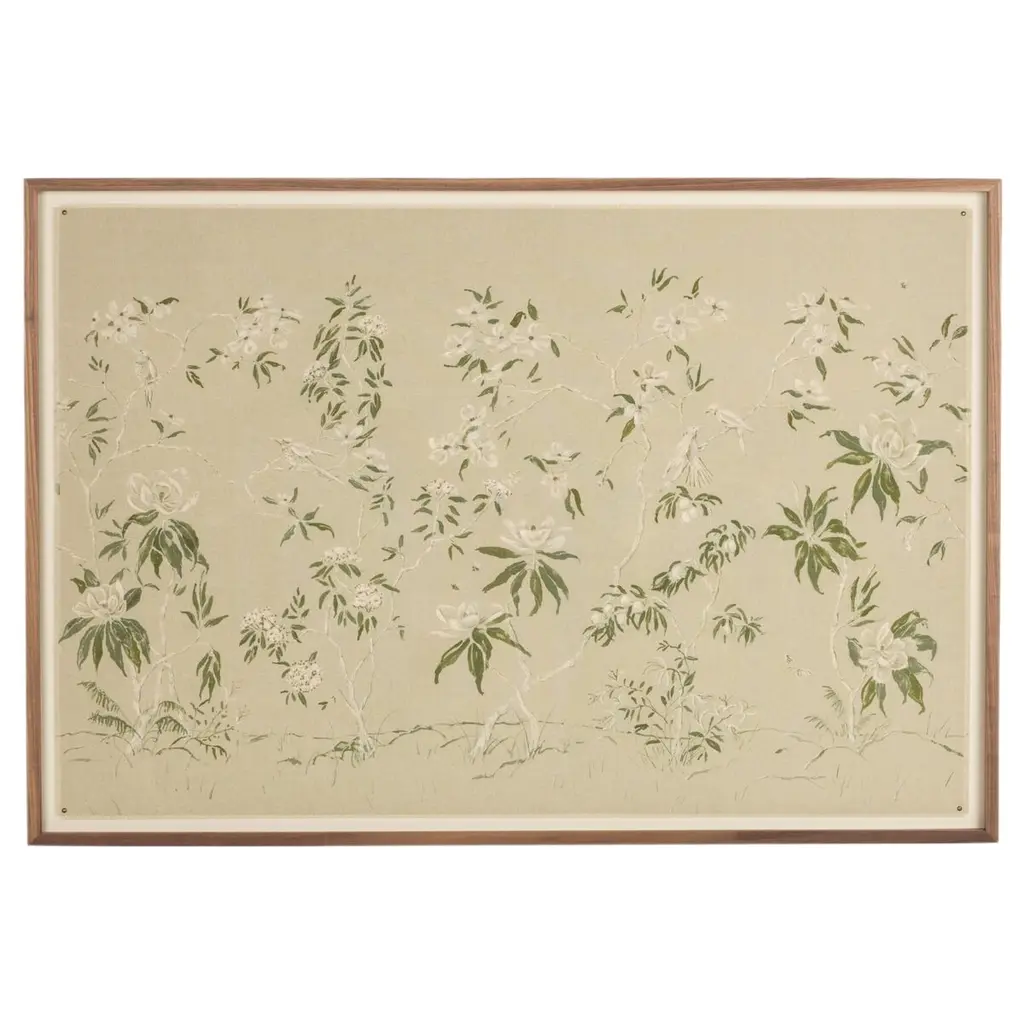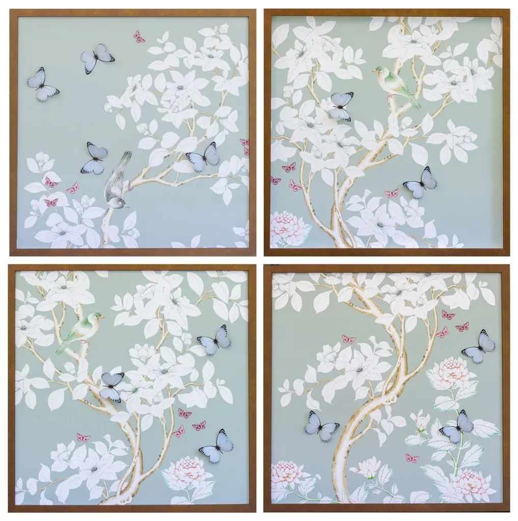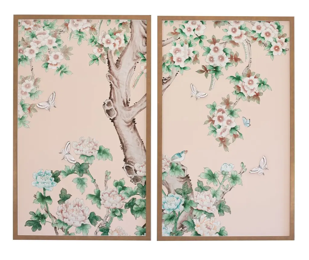 Hand-cut butterflies placed atop prints of delicately rendered trees add eye-catching depth to this chinoiserie-inspired diptych. The pictures arrive framed and ready to hang.